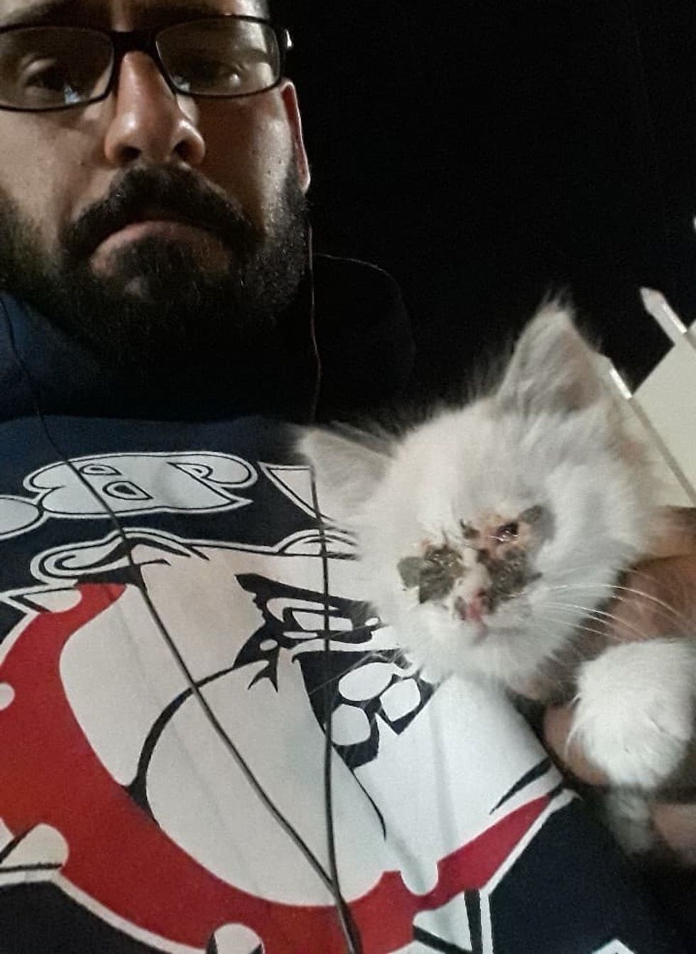 That night, he brought the kitten to the rescue where they removed the hard crust on her eyes and gave her the medical attention she needed.
