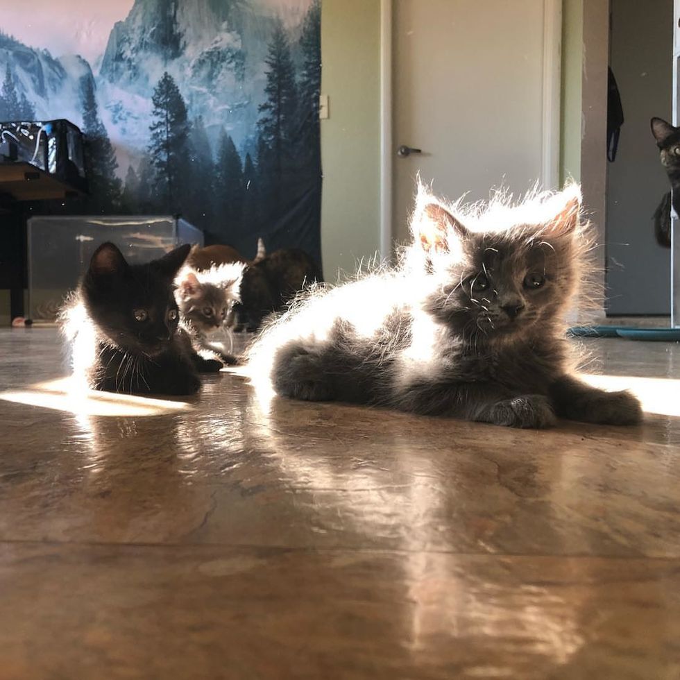 Every morning, when the sunlight shines into the kitchen, Wolfie and her sister from another mother come rushing to catch sun beams.