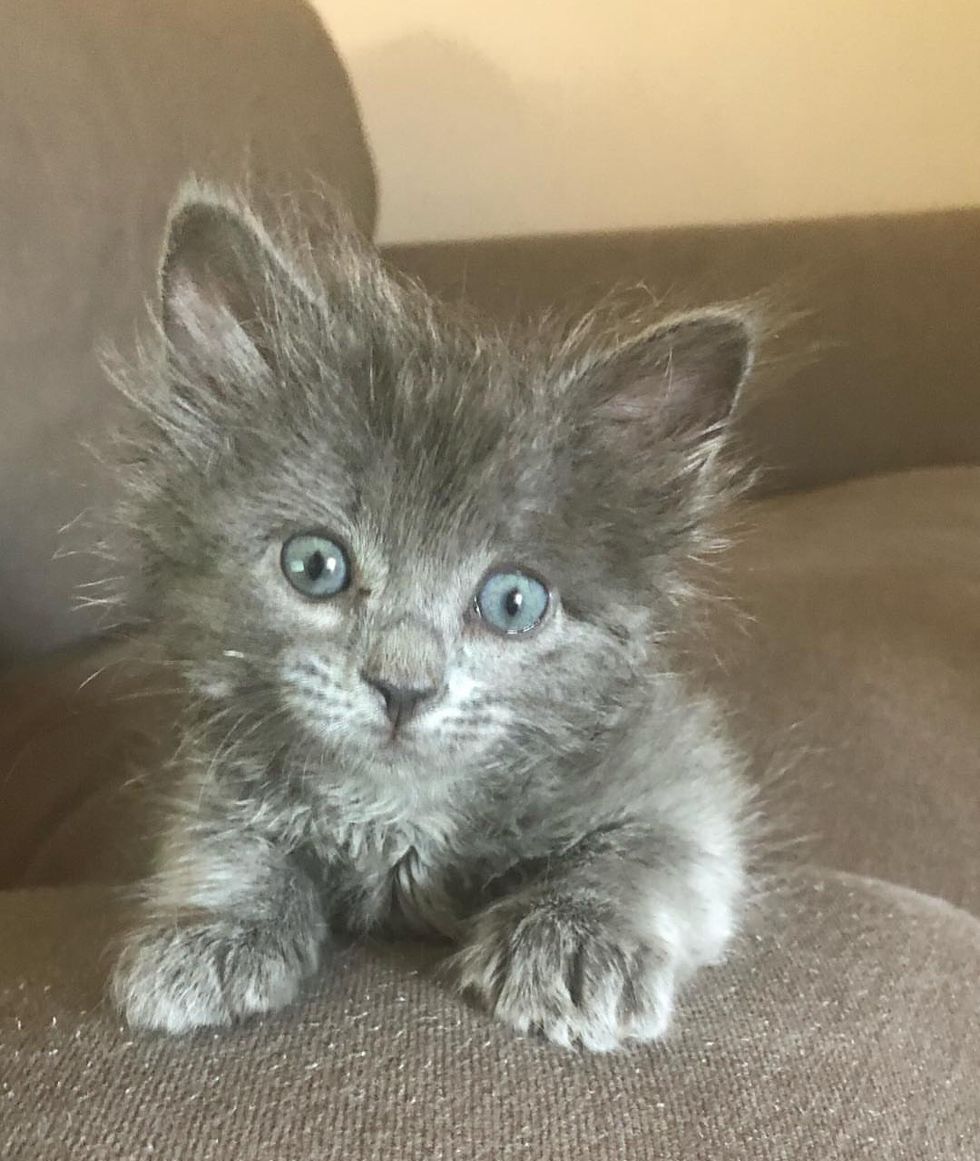 A few weeks later, the little miracle kitten tripled her weight and started to learn to explore. She would waddle around with a round belly while sporting her signature hairdo.