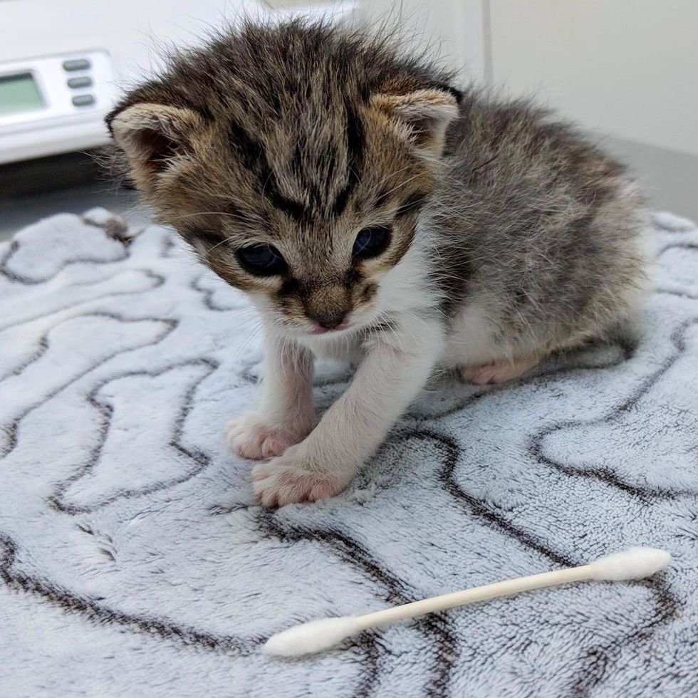 The kitten still has a lot of growing to do until he's big enough for adoption.