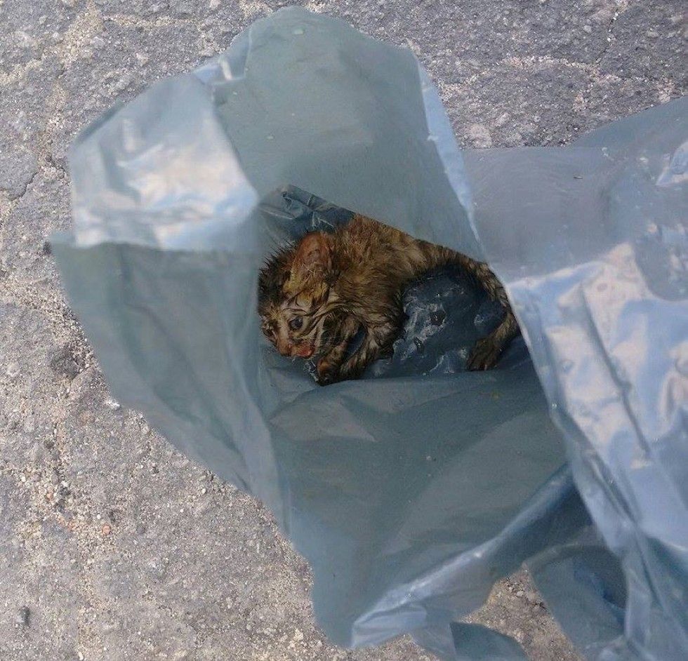 "When I heard those tiny and fragile little meows, I quickly untied the plastic bag which was closed by two strong knots, and found this little kitten, all wet and scared!"