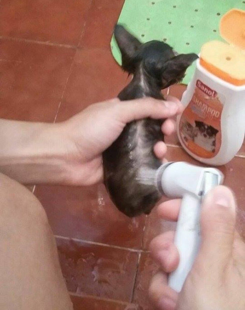 When the kitten finally felt comfortable with her new surroundings, she was given a very needed warm bath.