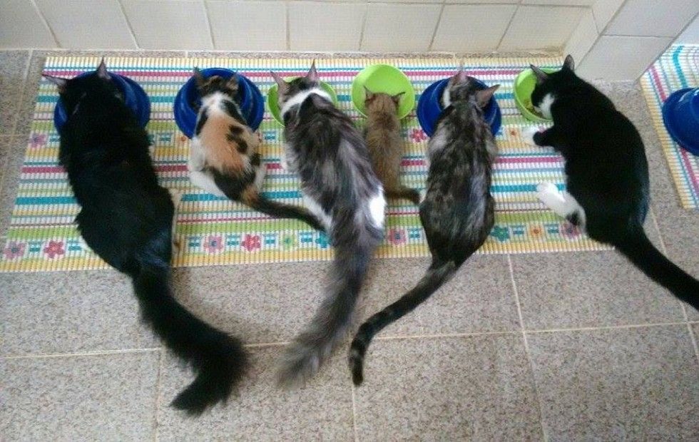 "Now, she eats a lot (dry and wet food) and loves her new furry brothers and sisters!"
