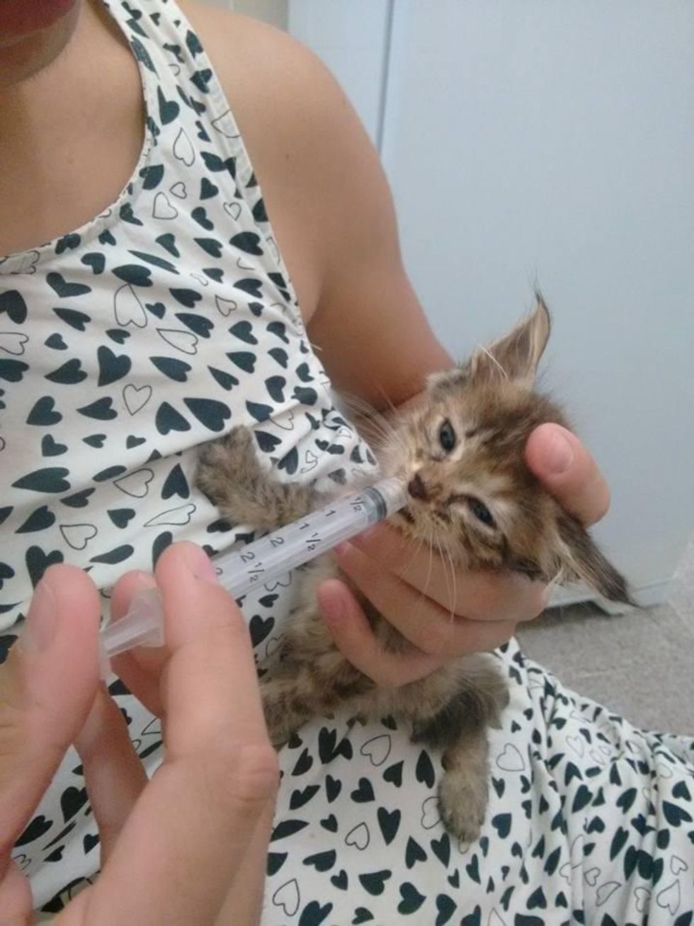 Aline fed the kitten with a bottle and a syringe. The moment the kitten started eating, she saw hope.