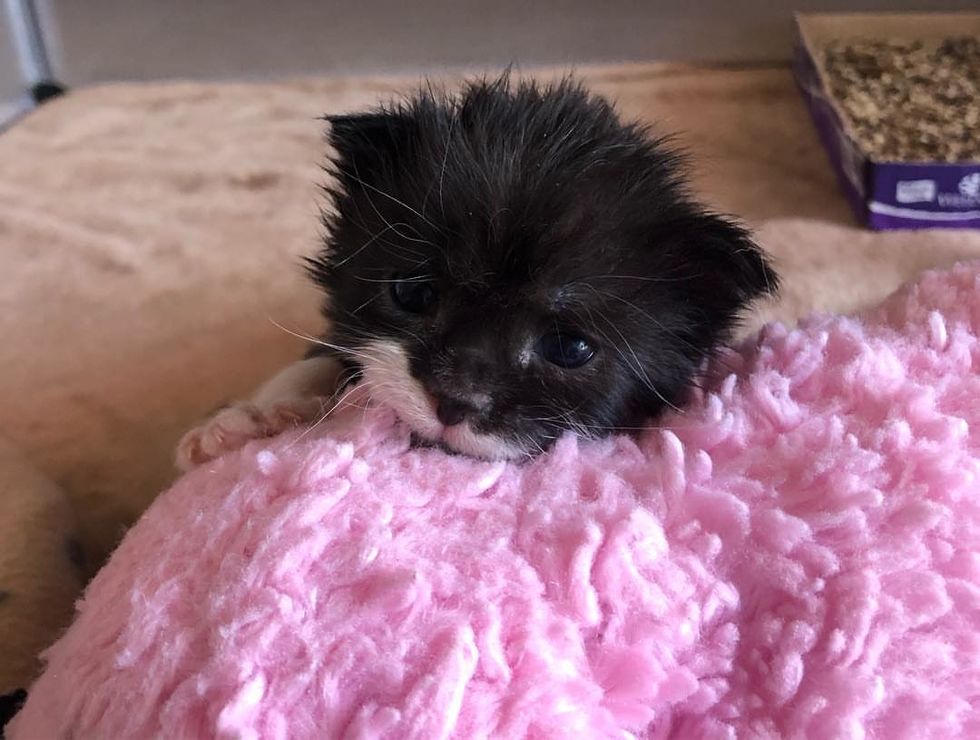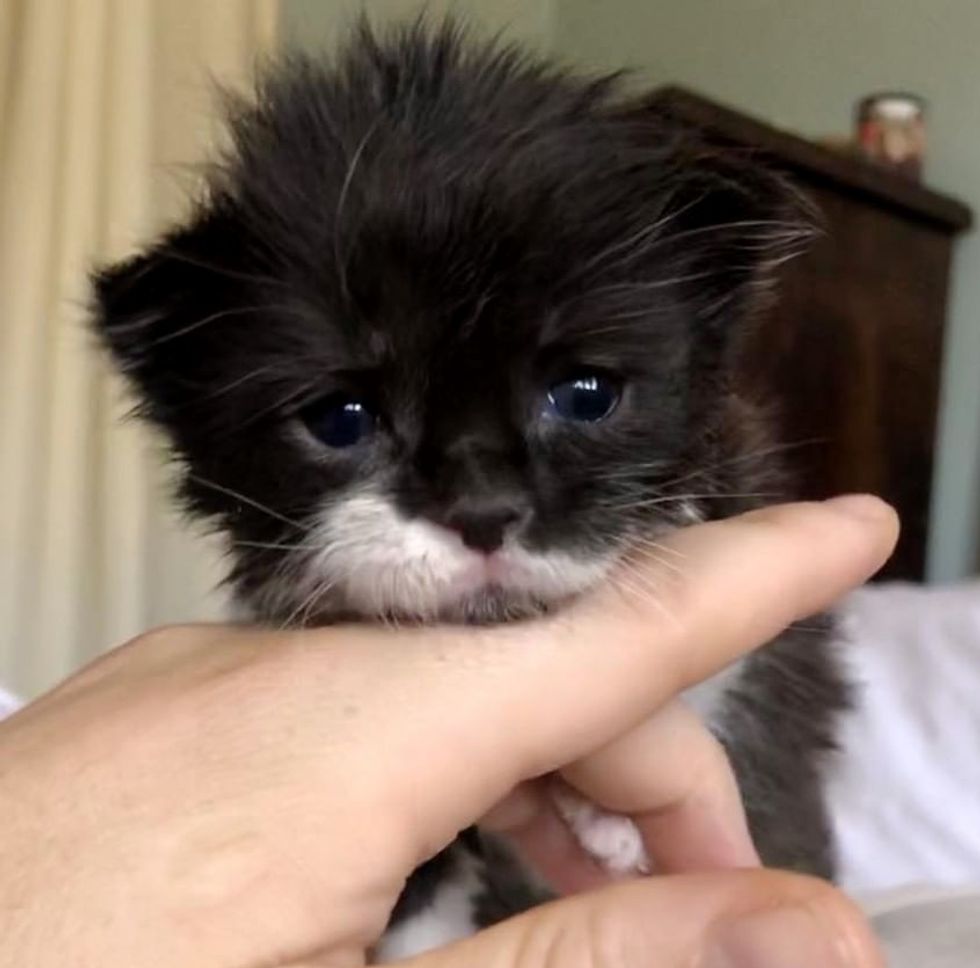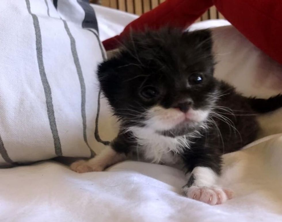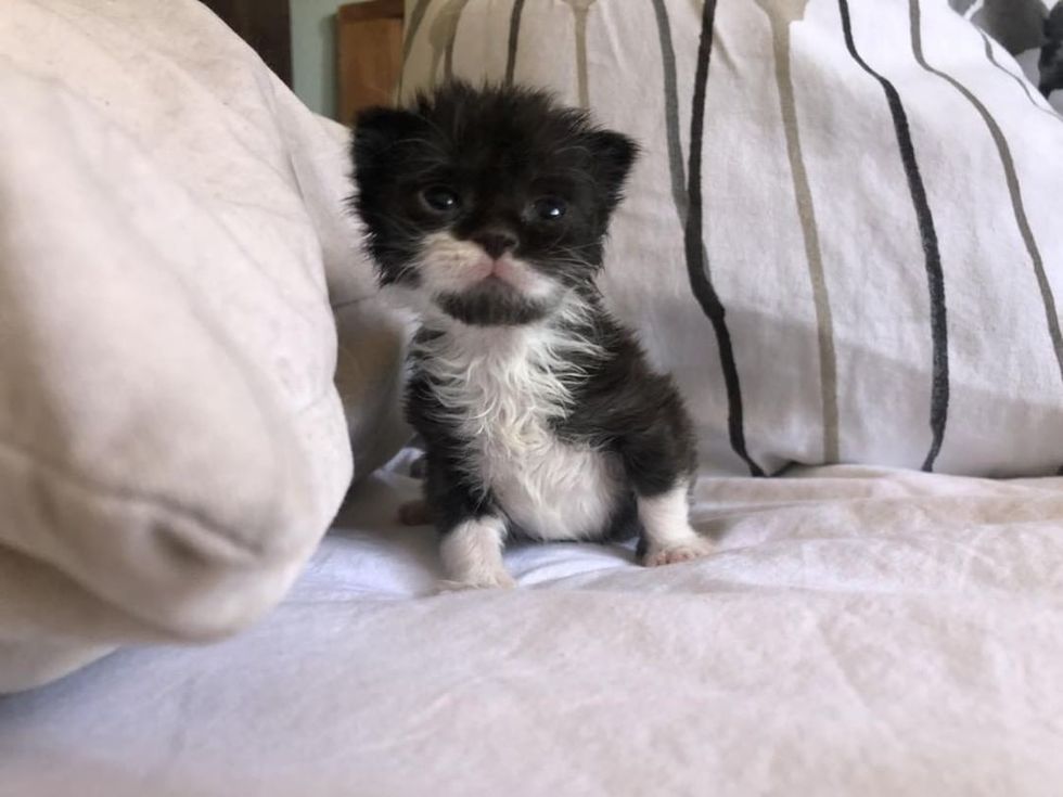 She spotted a tiny black and white kitten on the road. The weather was stormy, so she got out of her car, scooped him up and drove home. Later, she posted a plea on a Facebook group, asking for help.
