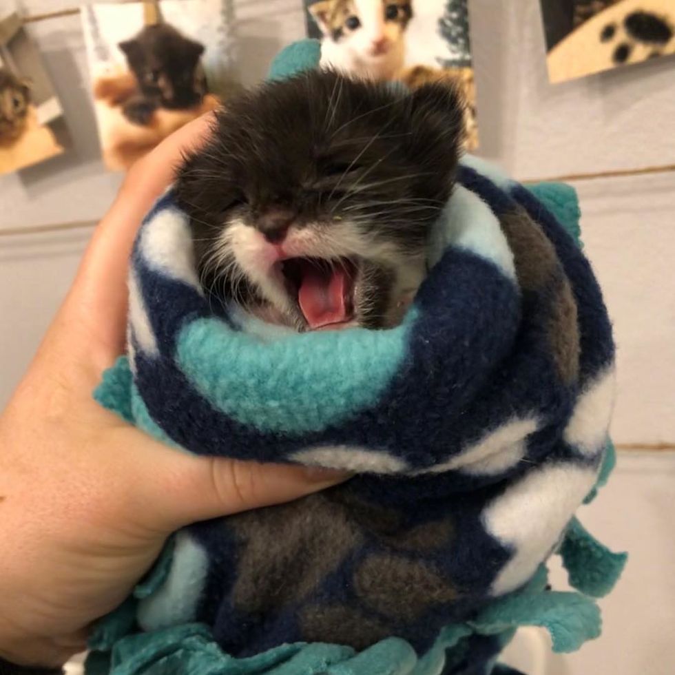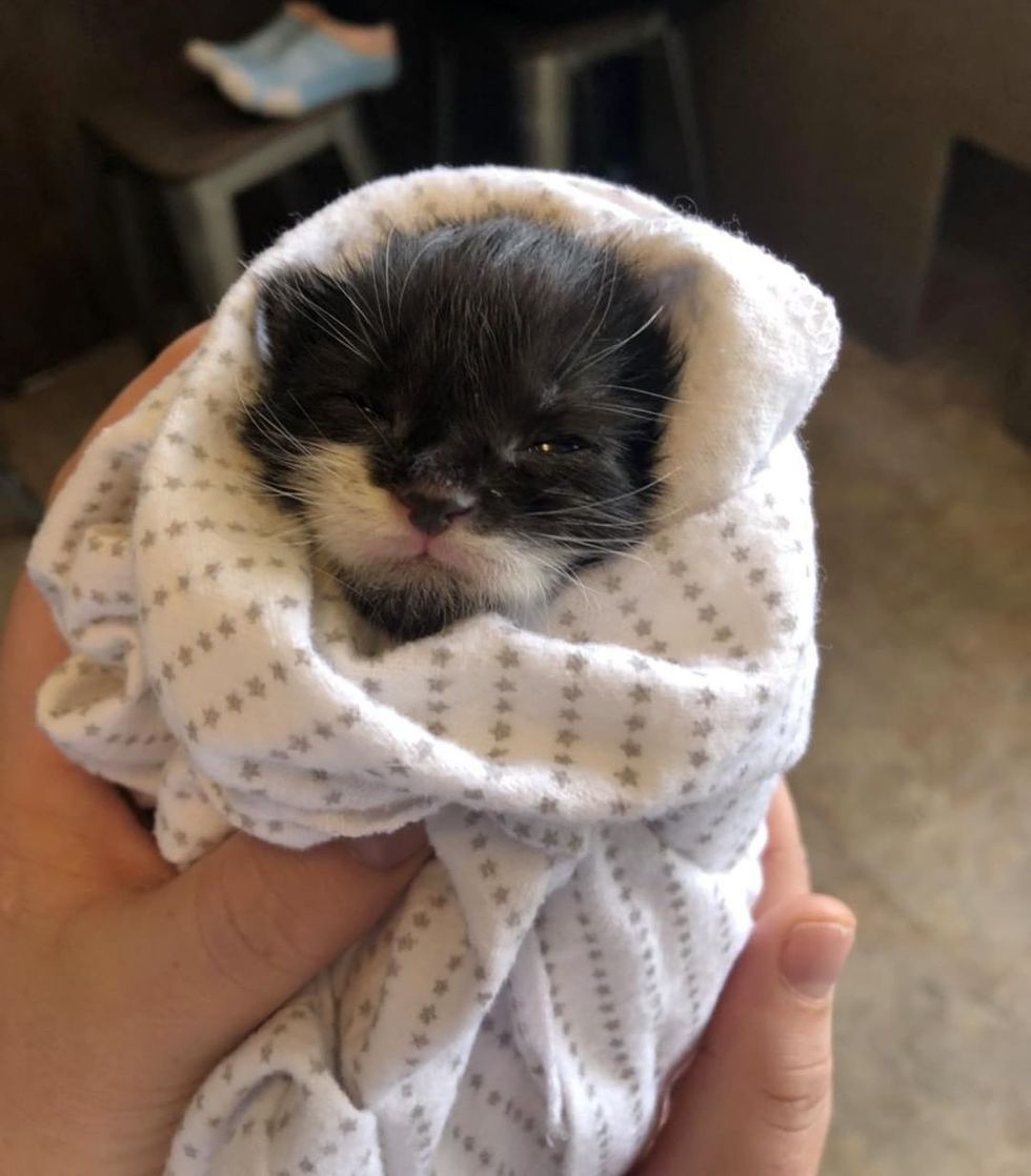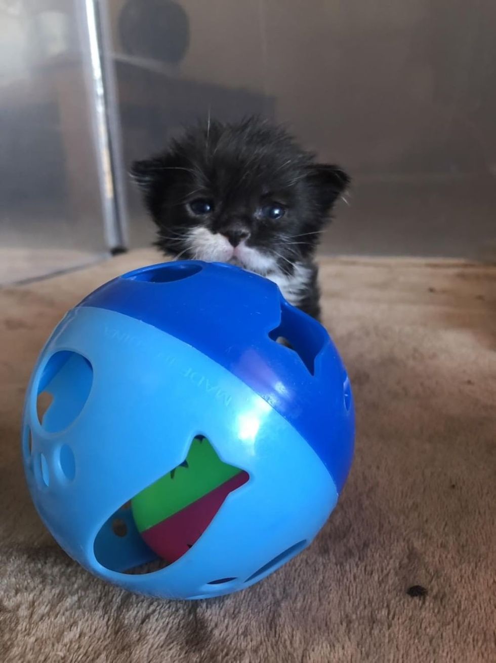 She spotted a tiny black and white kitten on the road. The weather was stormy, so she got out of her car, scooped him up and drove home. Later, she posted a plea on a Facebook group, asking for help.