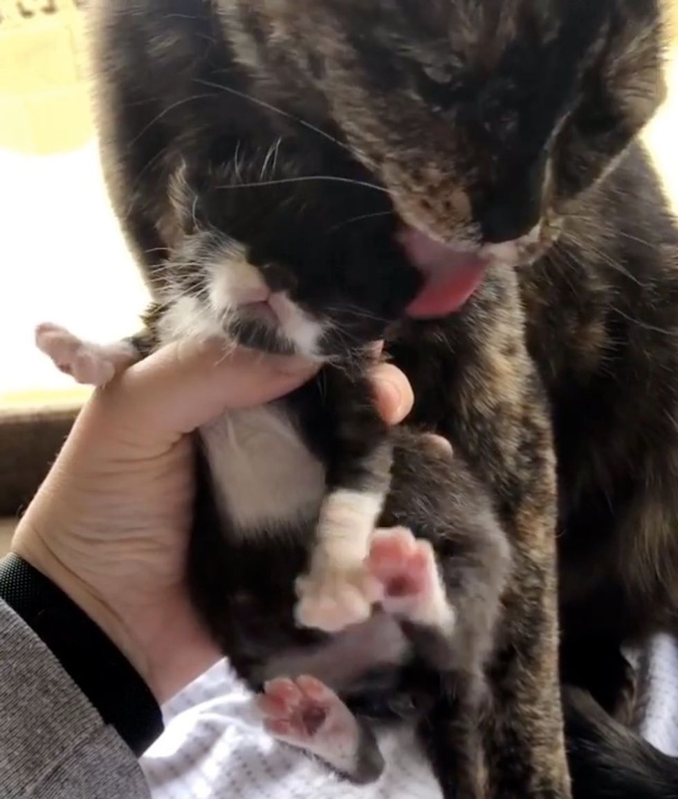 She stepped in and started grooming him and caring for him like a mother would. Not only did she calm him down, but the kitten perked up and started to purr.