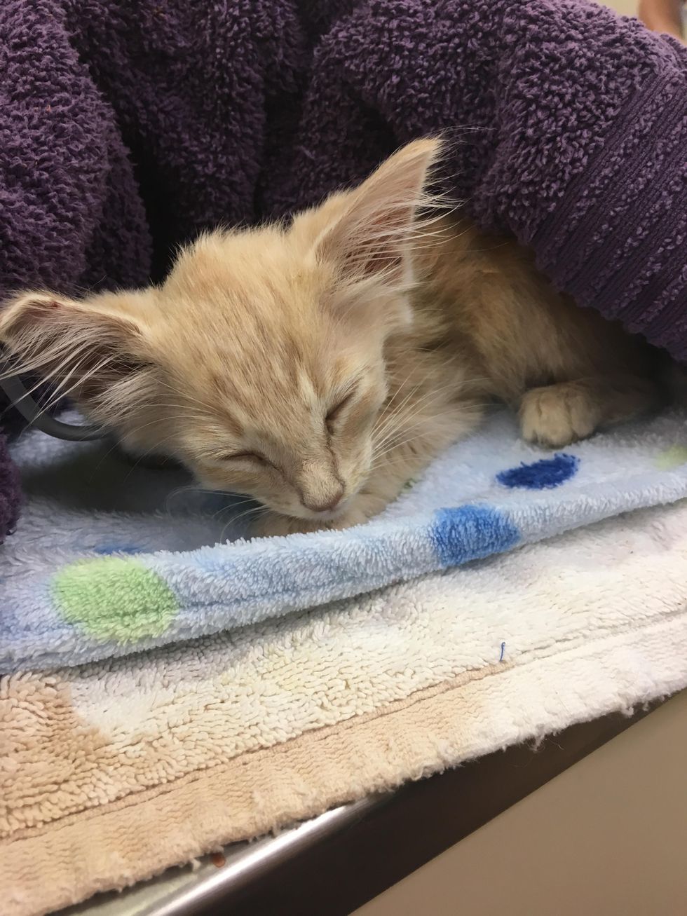 Once they got the kitten, they realized just how poor his health was. They had to rush him to the vet due to a seizure and his glucose level was dangerously low. Dr. Jo Querner and her team at Cross Timbers Animal Hospital (McKinney, TX) brought the little guy back to life.