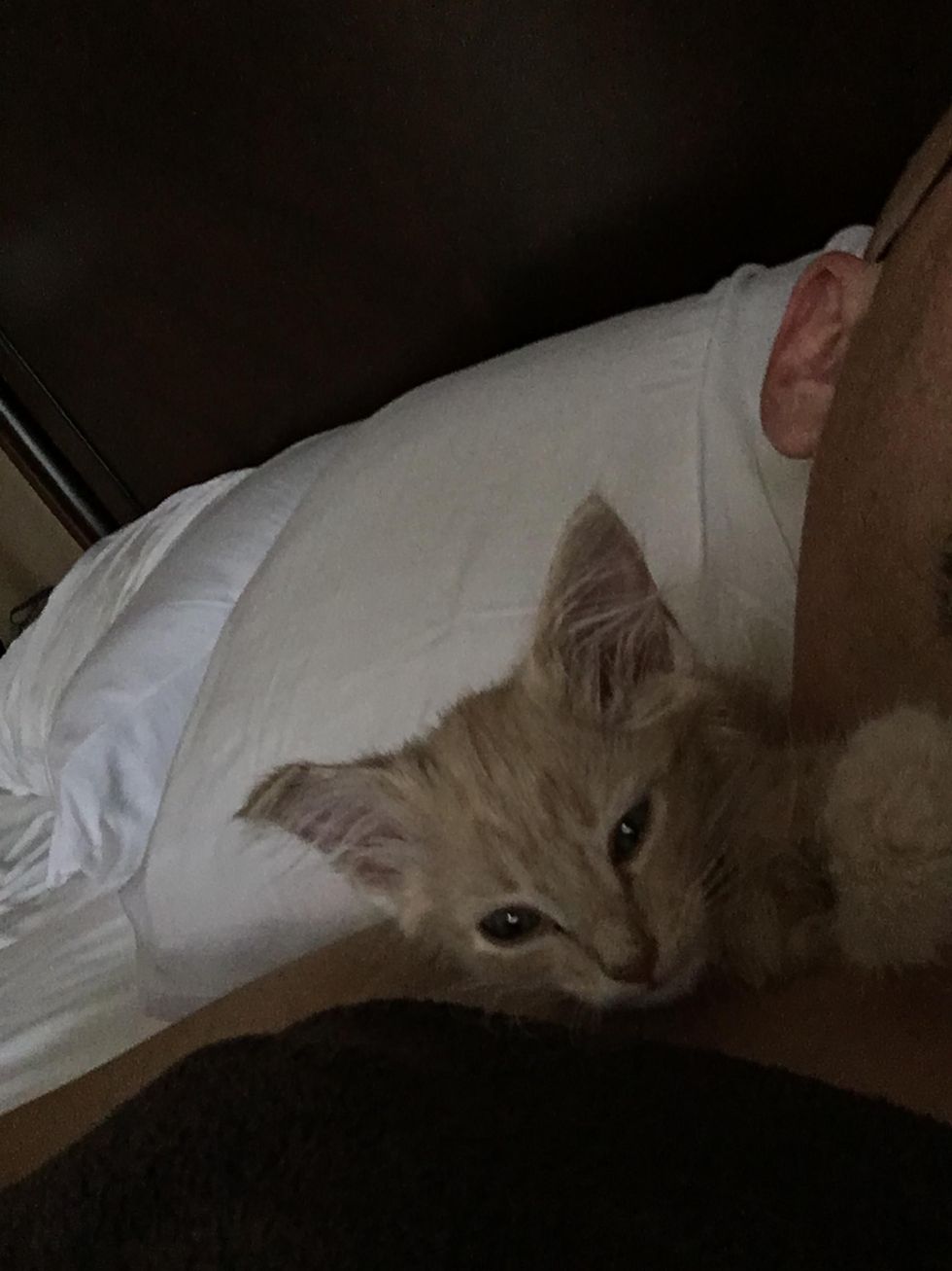 Wilson cuddles with his human dad for an afternoon nap. "We just took an afternoon nap together. I like this picture, you can see his bent ear."