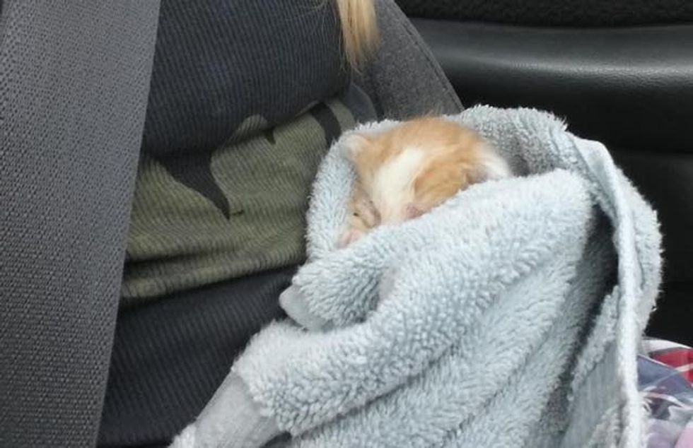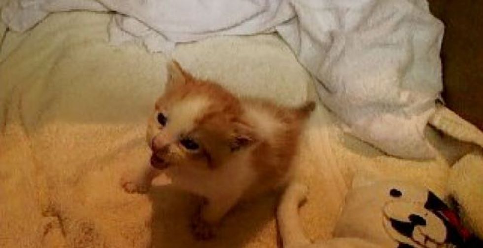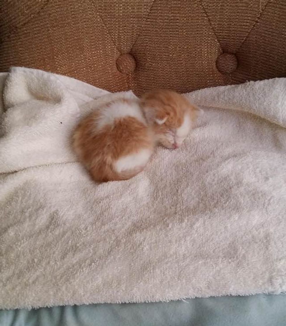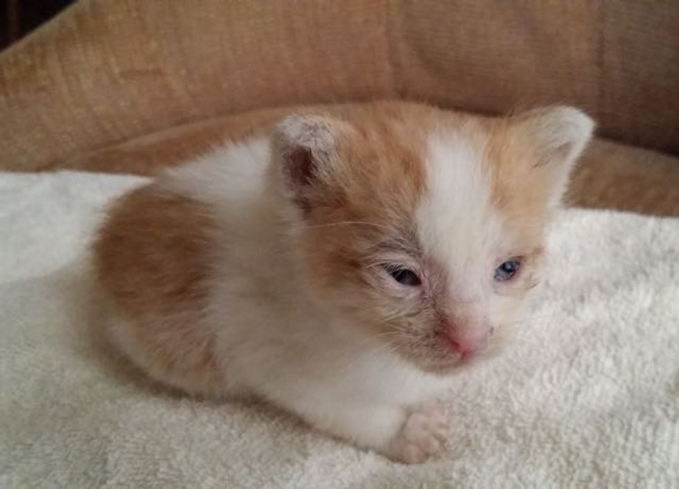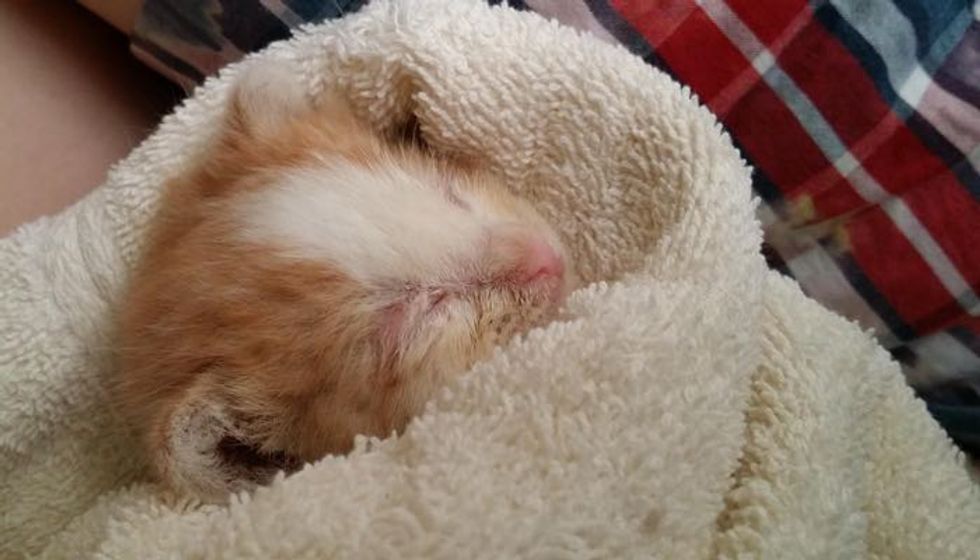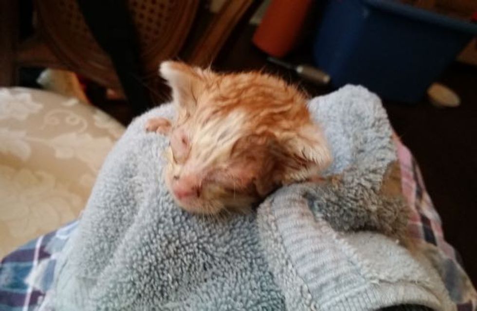 His eyes were shut tight. They picked up the kitten, gently cleaned off the flies around the eyes and wrapped him up in a towel. "Then we went to get formula," imgur user metalcupcake wrote.