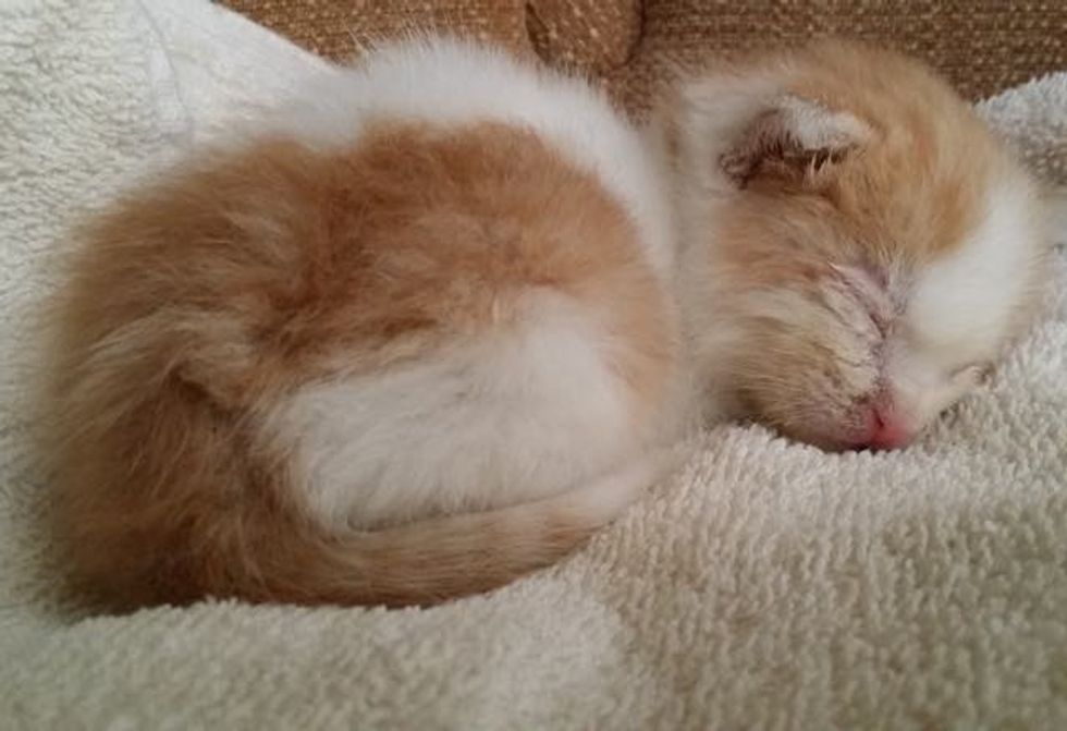 They heard cries in a garden and followed them till they saw a tiny ginger kitten screaming in a flowerbed covered in flies.