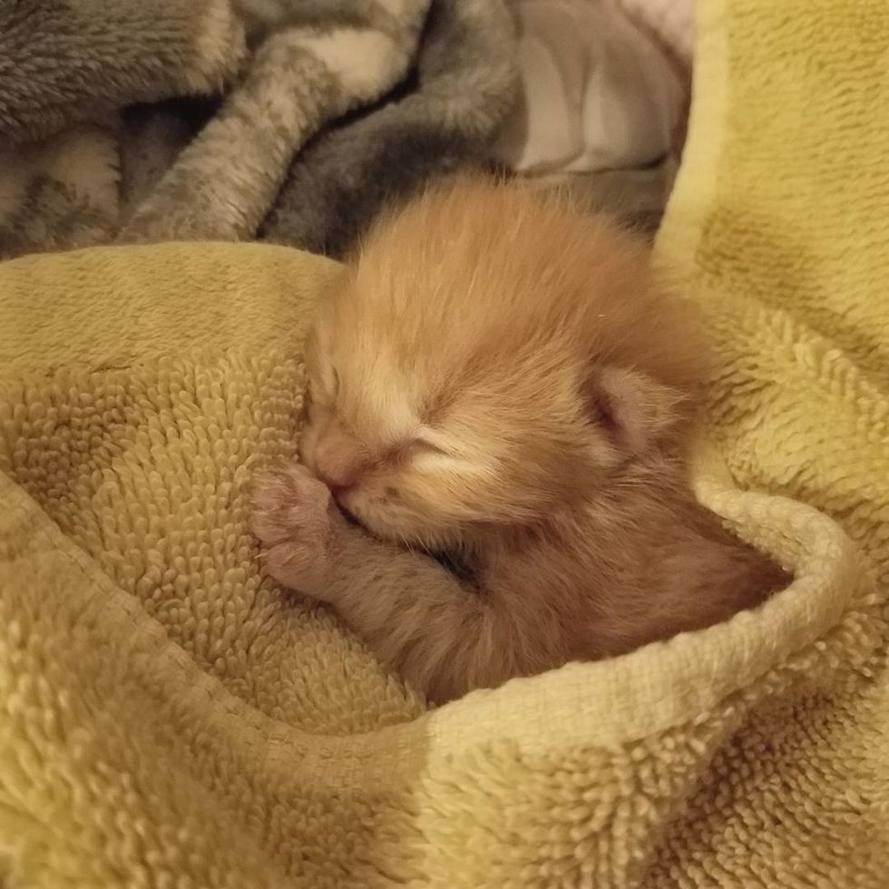 After cutting a few holes in the wall, they finally found the kitten - a tiny 3-day-old ginger, meowing loudly for his mother, who was nowhere to be found. It was believed that the cat mom accidentally lost him inside the wall while moving her kittens.