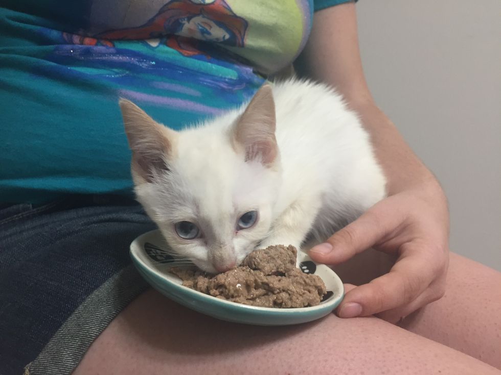 "When his mother finally returned to the yard, he followed and meowed at her constantly while she gobbled up the food. When he tried to follow her out, she hissed at him and left him behind crying."