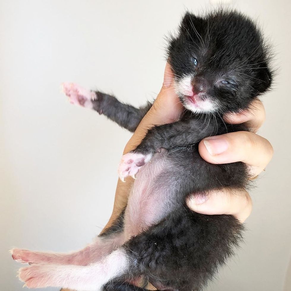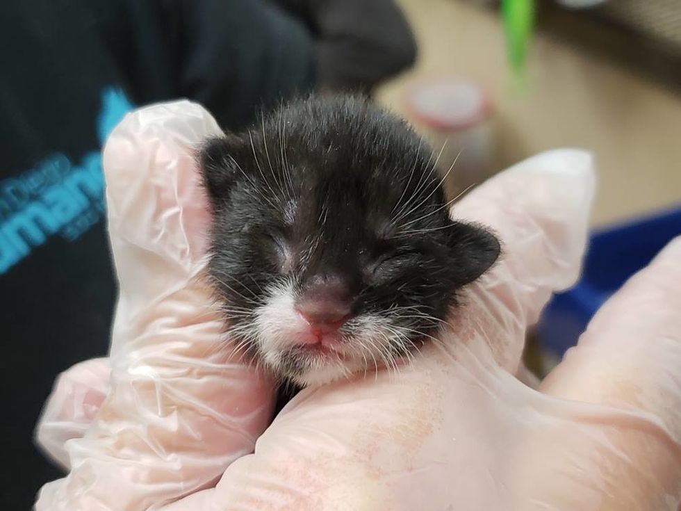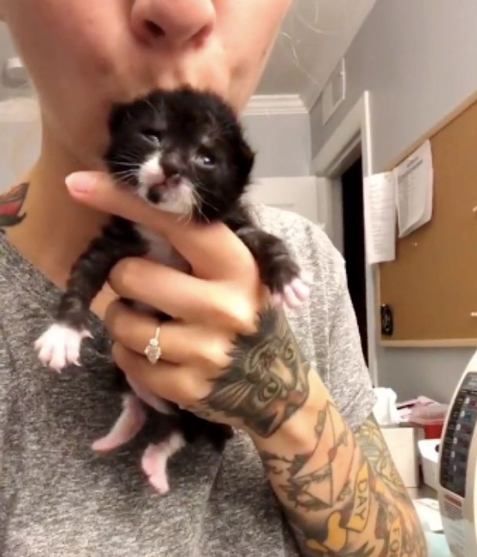 The little tuxedo was placed in an incubator to keep her warm and comfortable as kittens her age can't regulate their own body temperature.