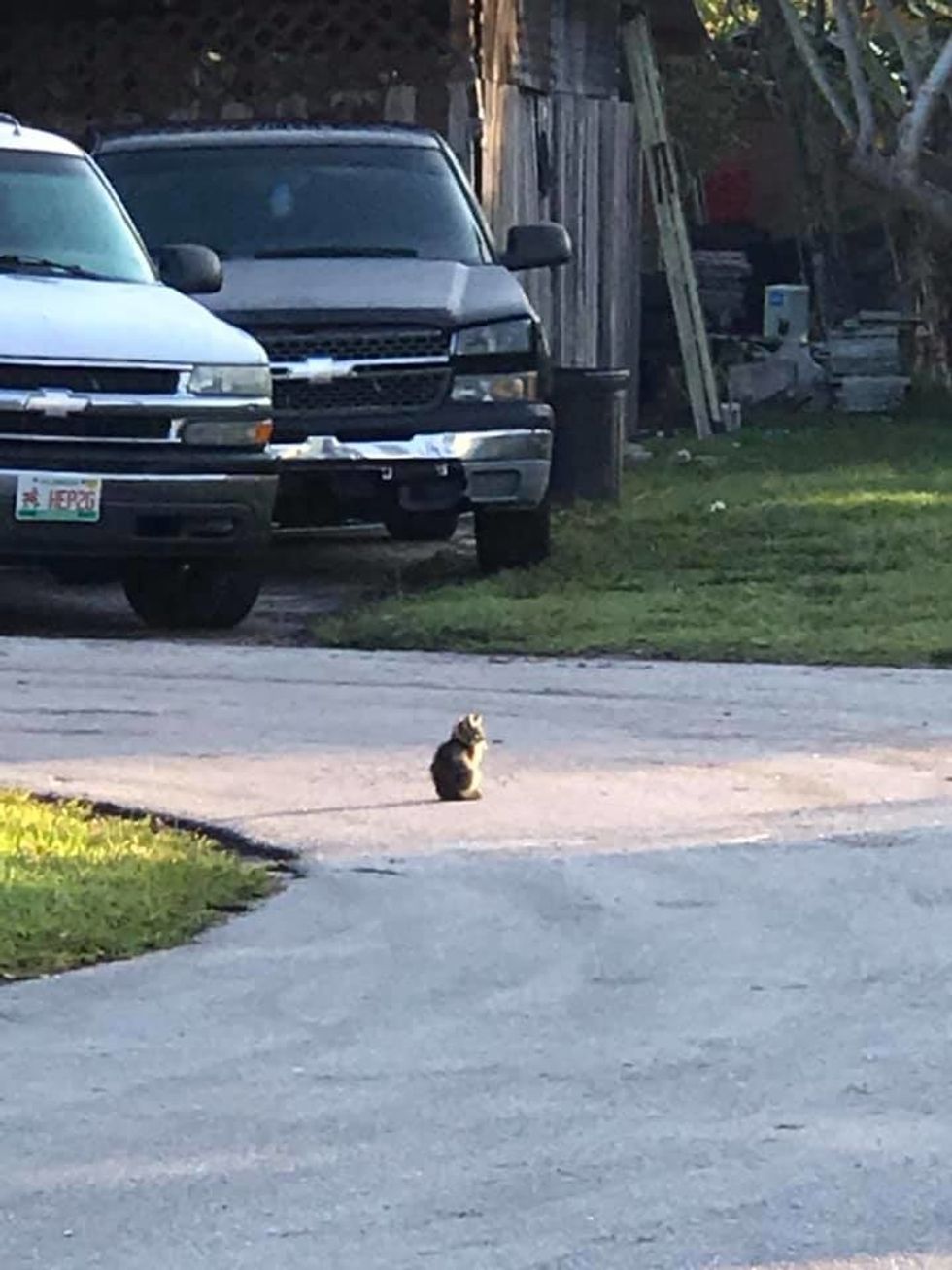 There's a large feral cat population in the area, but she had never seen this kitty before. As she approached him to see if he was friendly, the kitten immediately fled.