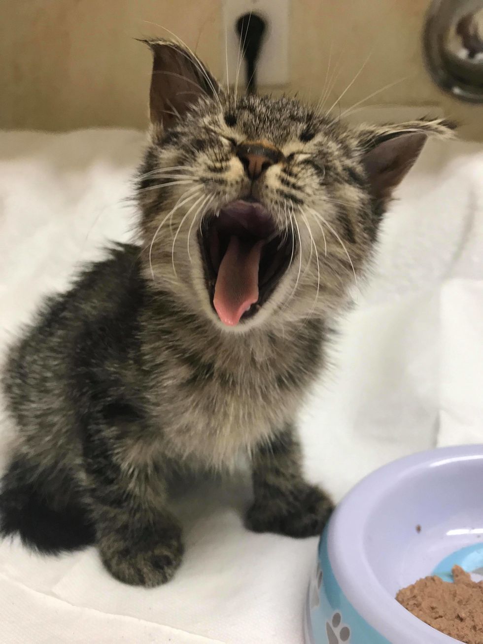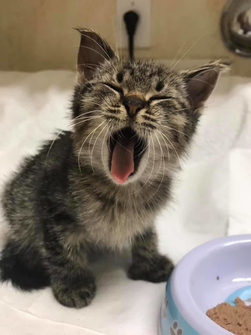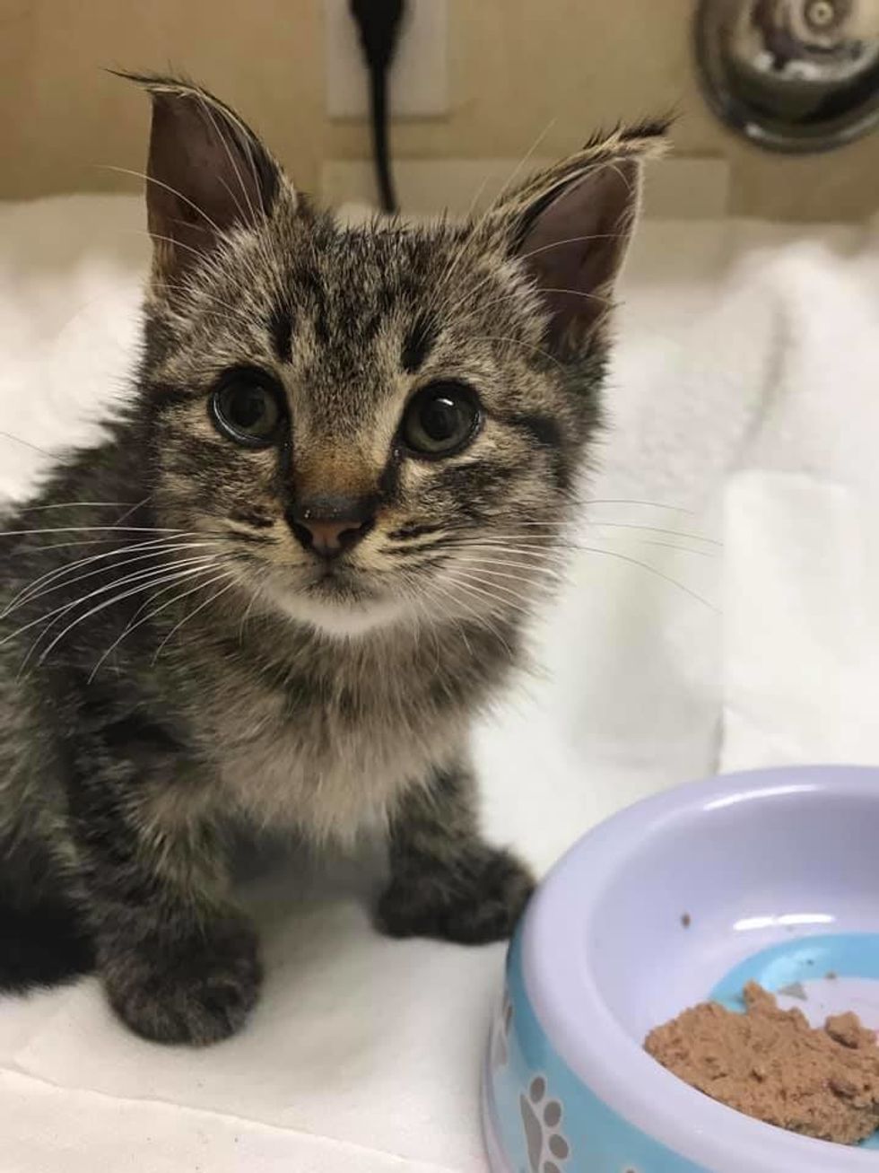 The kitten was so hungry that he scarfed down all the food while he was in the trap. He was covered in fleas and needed treatment for worms.