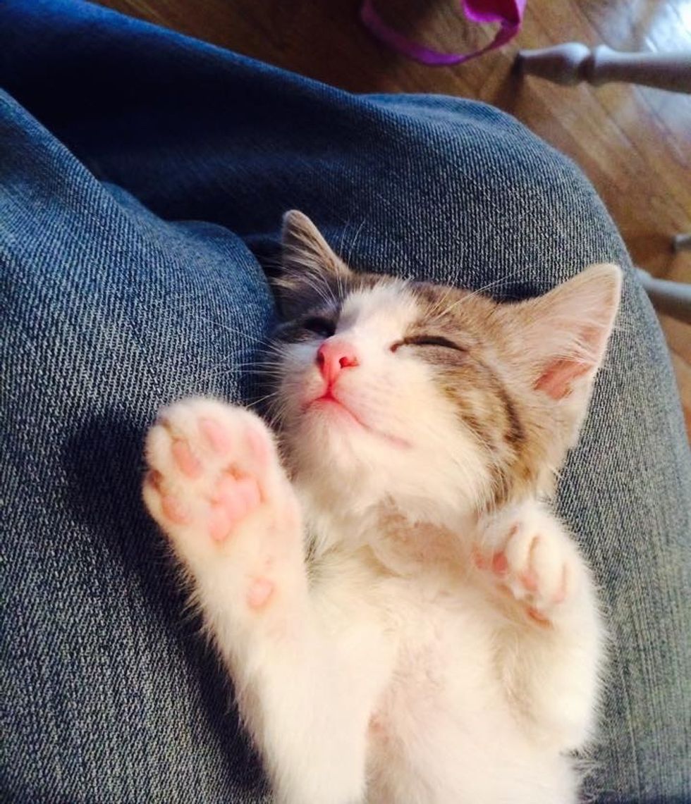 Man Kitty grew by leaps and bounds. He passed out in a food coma lying in his mom's lap after a good, hearty meal.