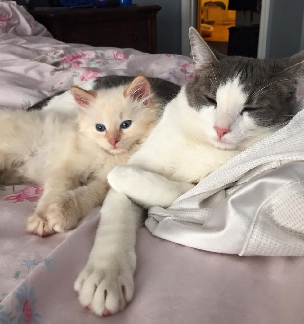 Man kitty taking care of his foster brother, Aiden.