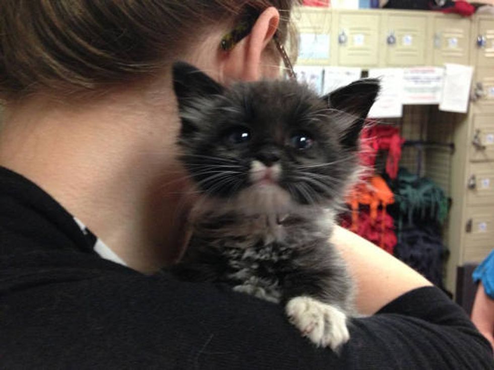 Ashton was found under a car covered in oil. This is him arriving at Tonis Kitty Rescue