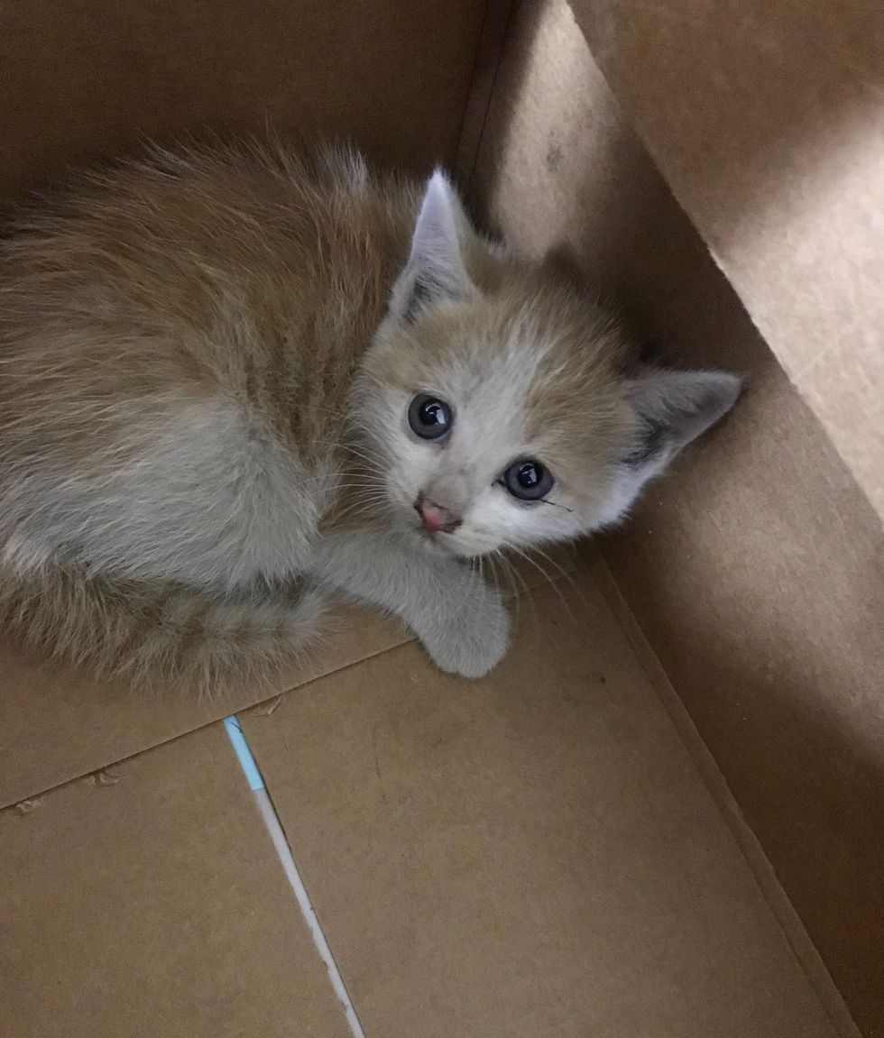 Restrepo, a cat guy, who has a soft spot for animals in need, immediately offered to take her. As he placed the kitten in a large box for transport, he saw those beady eyes looking at him, terrified. He tried to comfort the kitten while taking her home.