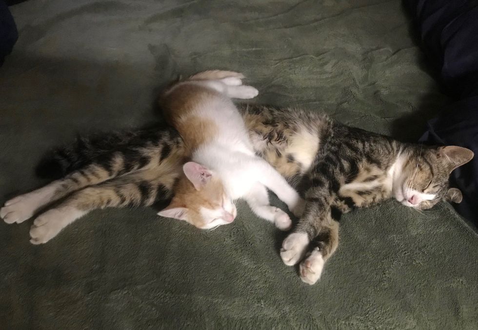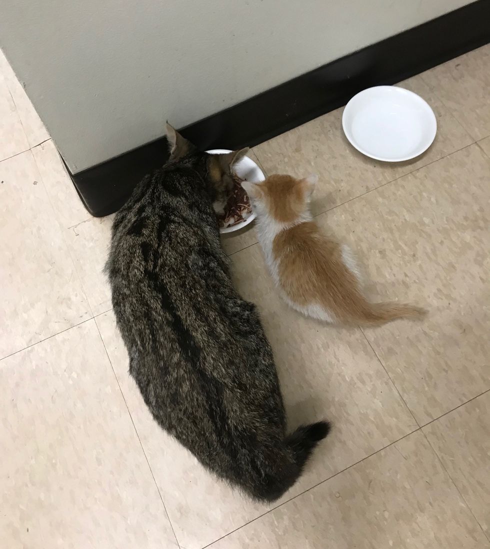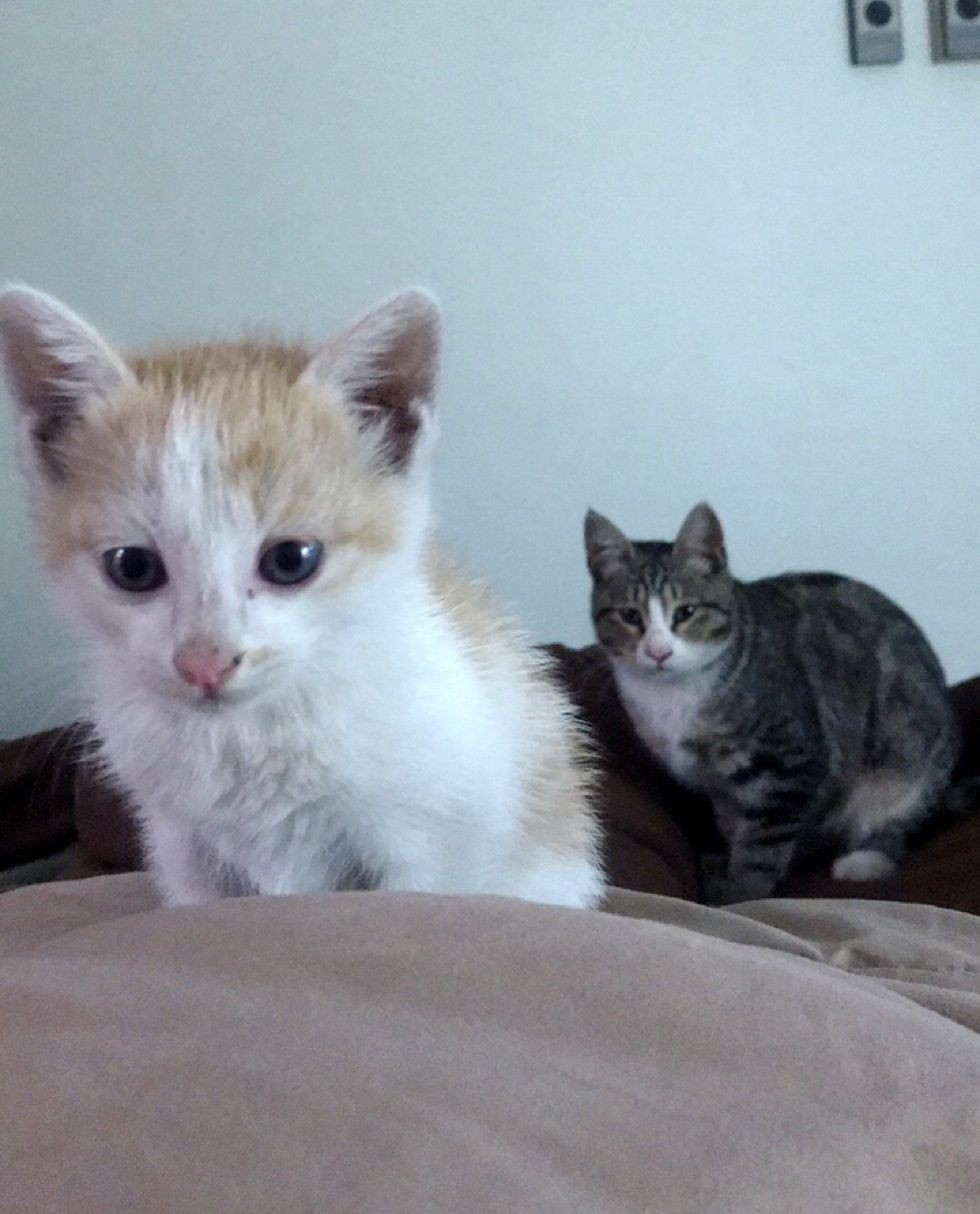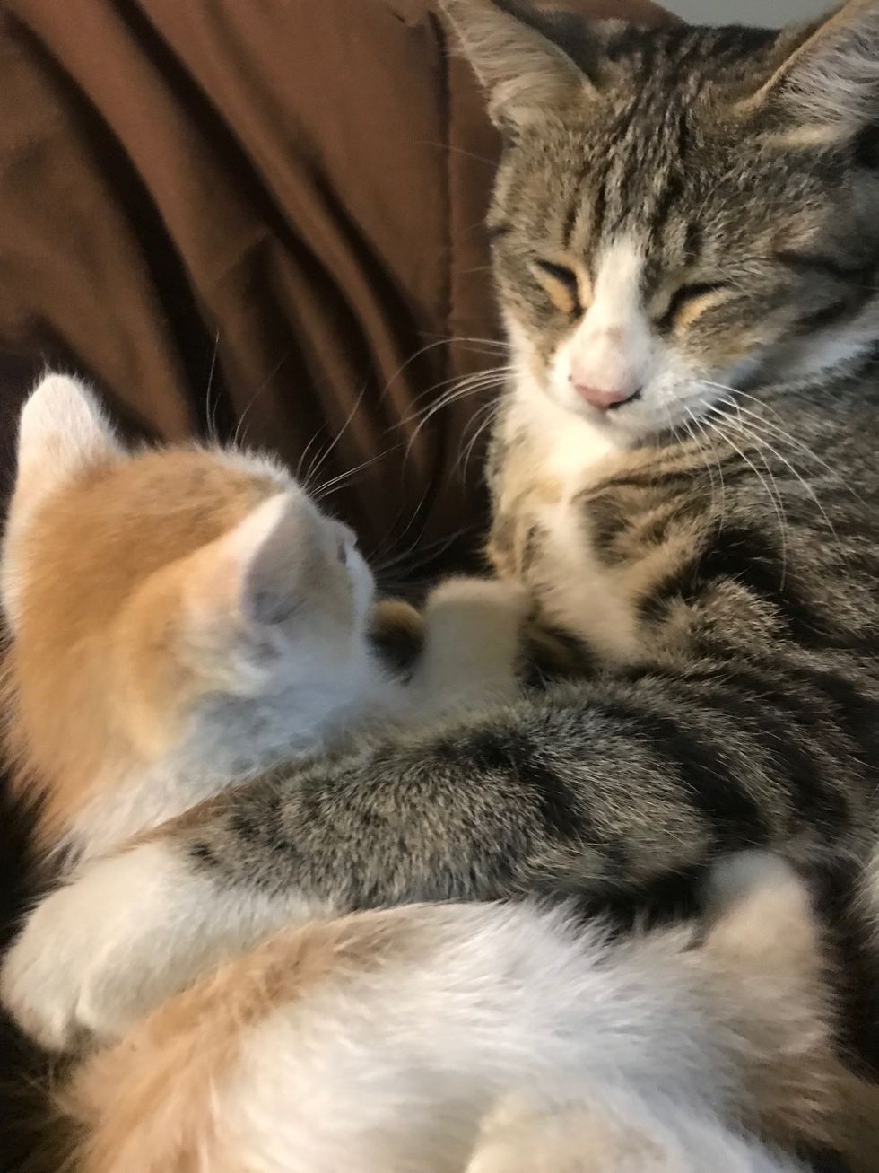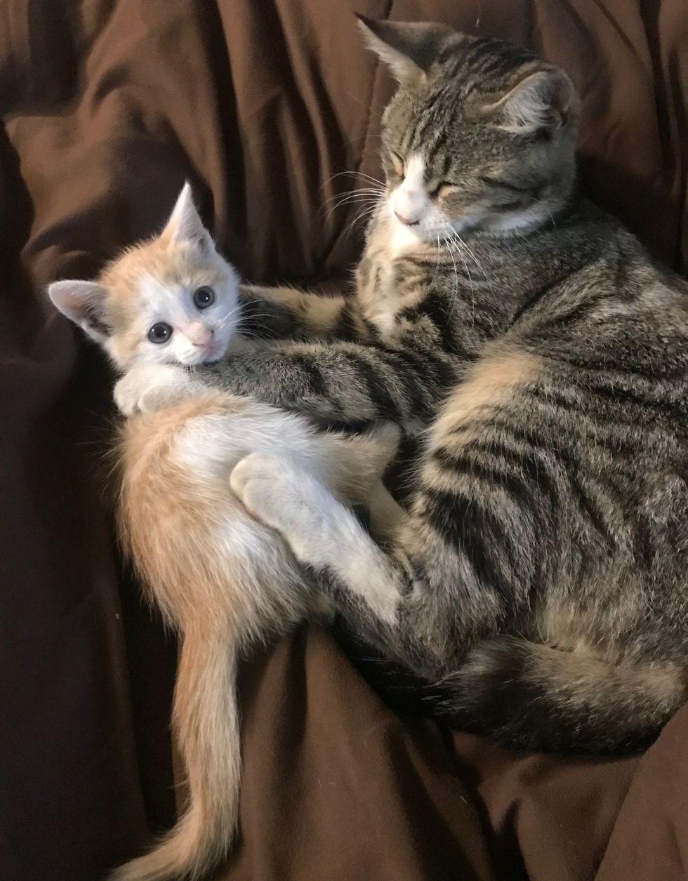 He shows her the ropes around the house, teaches her how to be a cat, and is always there for her when she needs a cuddle.