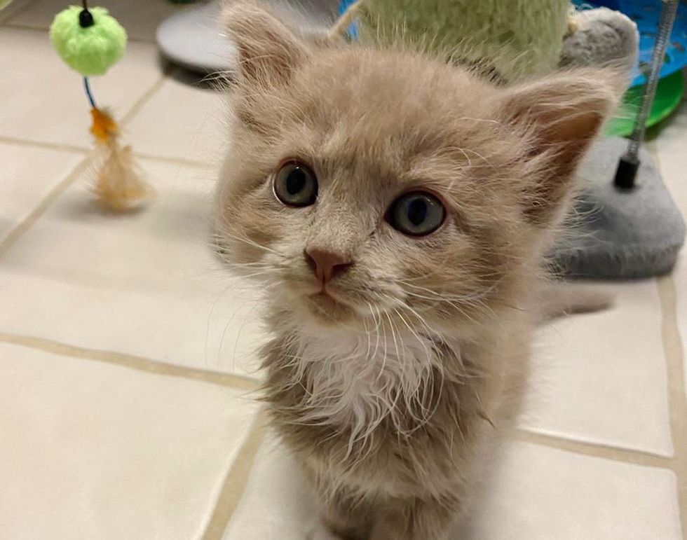 The kitten named Roz was covered in dust. After a much-needed bath, her coat went from brown to light grey. She turned into a tiny baby bear with her fuzzy hair, big paws and long whiskers going in all directions.