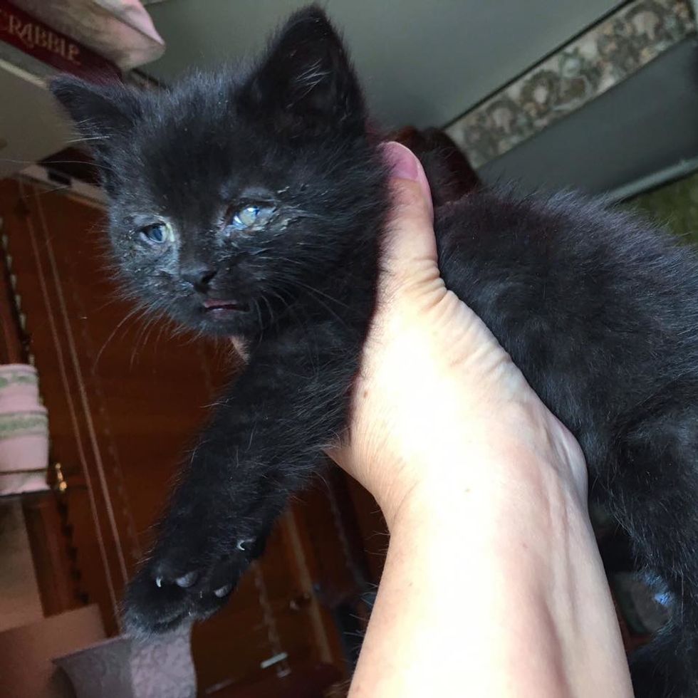 The kitten was friendly and started to purr as soon as she picked him up. It was as if he wanted to be helped. Stella, a neighbor, got him some food and medical attention for his eyes.