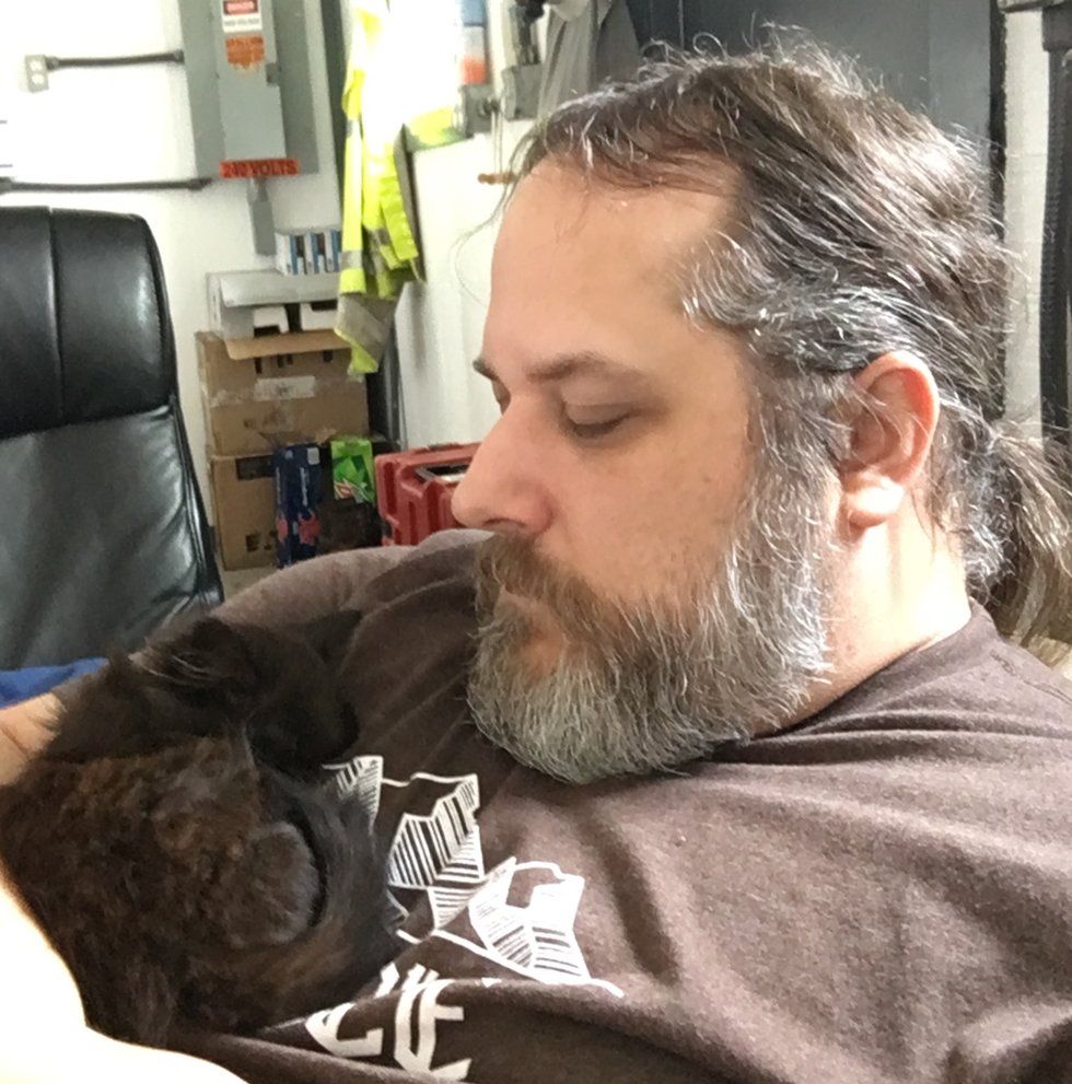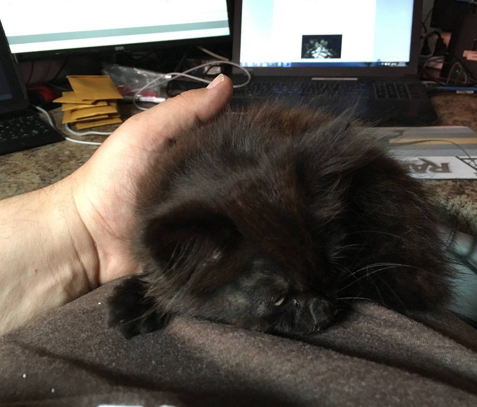 He made a makeshift bed for Spud with a pillow and a shirt as a blanket in his chair, so he could continue working while the kitten snoozed through the day.