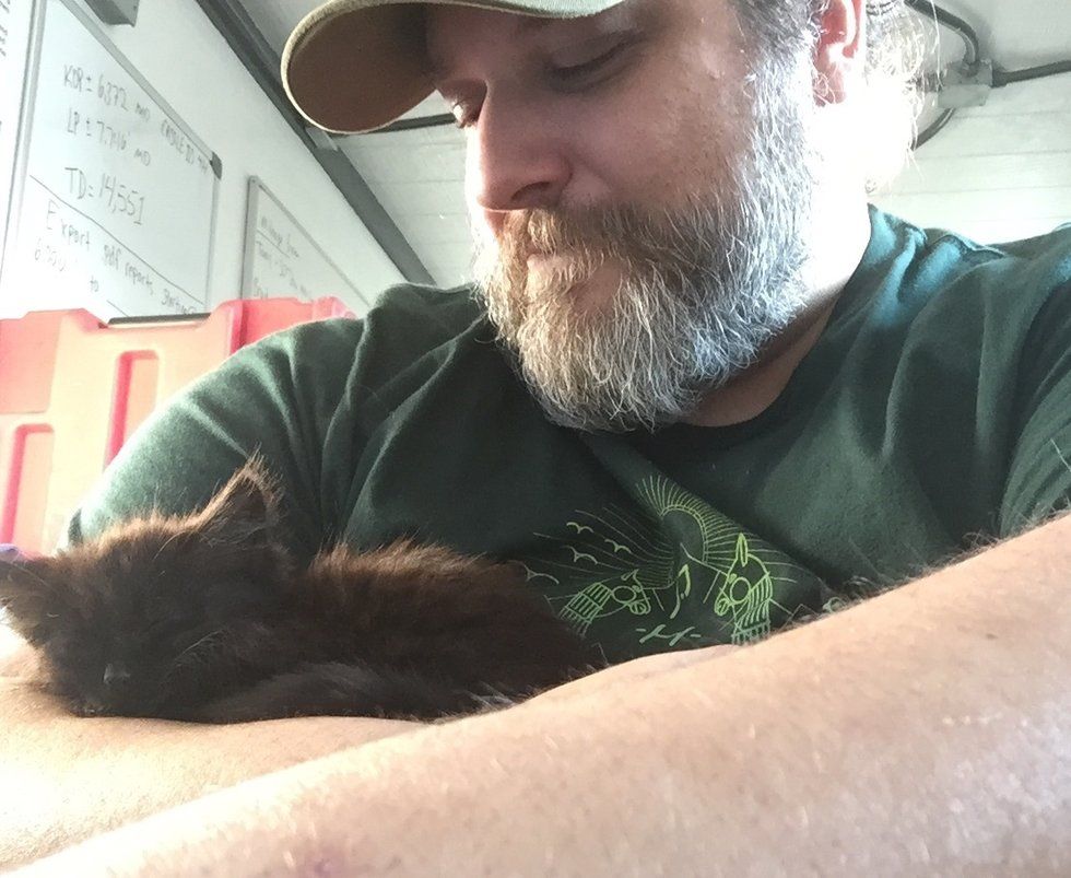 The kitten spent all night snuggling with his rescuer and slept comfortably under his beard in his neck.