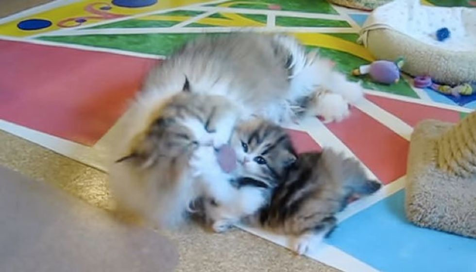 When cat moms give their babies a bath, it's a matter that they take very seriously. It's also a form of discipline when mamas think their kittens are being naughty.