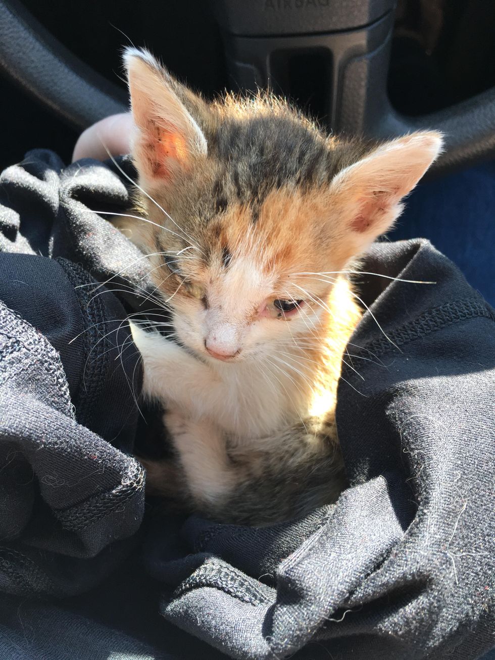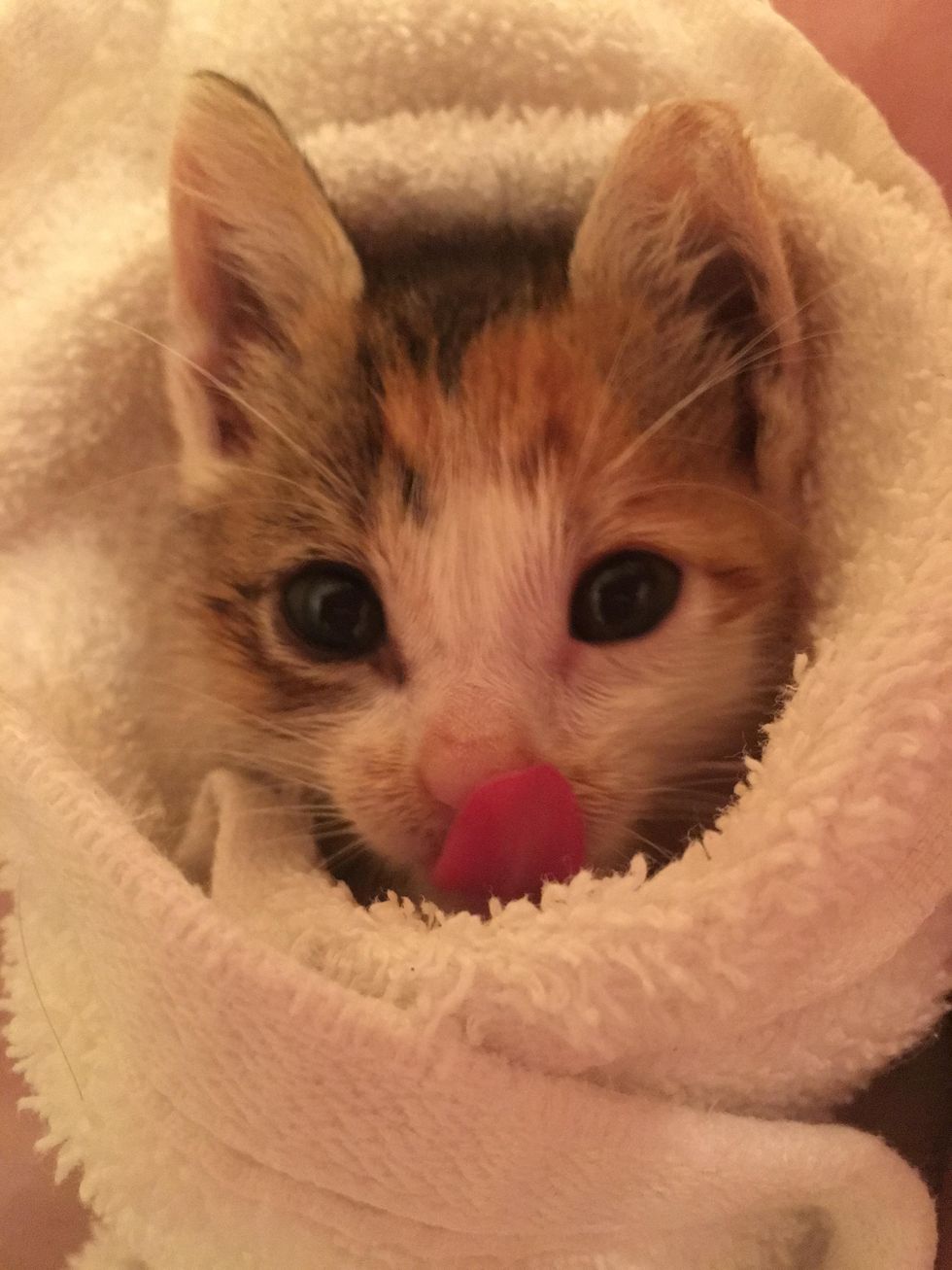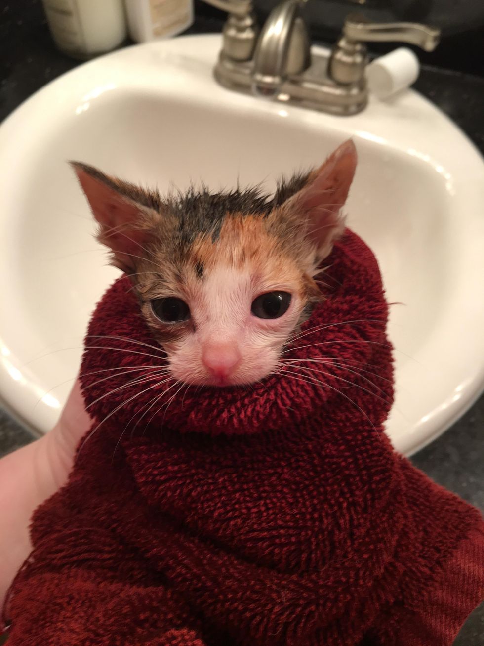 Over the next couple of days, the kitten craved more attention and cuddle time, so they wrapped her up like a purrito to keep her comfortable and warm. With constant love and care, her eyes quickly cleared up.