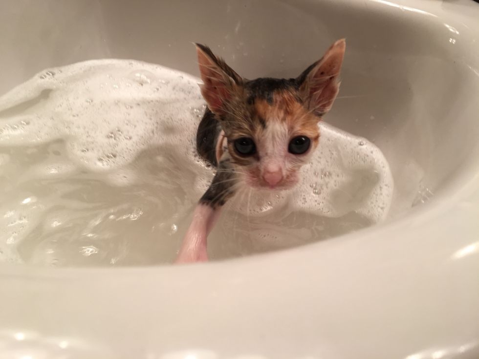 Once she was healthy enough, they gave her a much-needed bath with Dawn soap to remove the fleas.