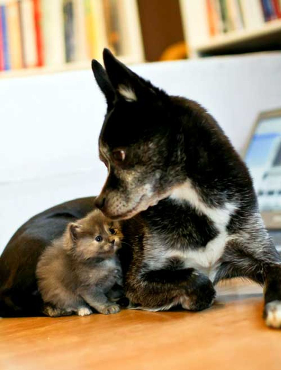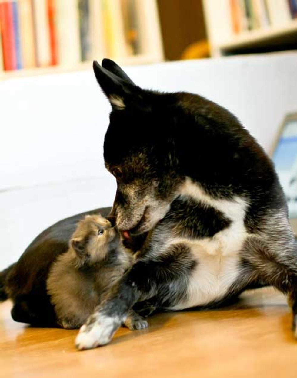 Little tortie kitty Dio nuzzles into the side of her canine kitty-sitter, Fenwick and gives him a kiss! Today this pair of lovebugs are still best friends living under the same roof.