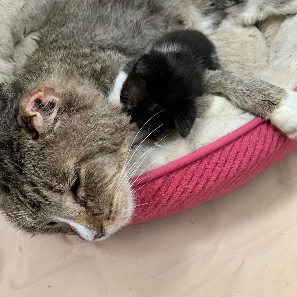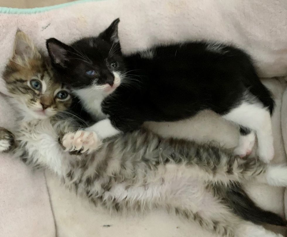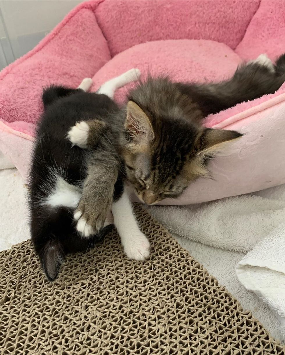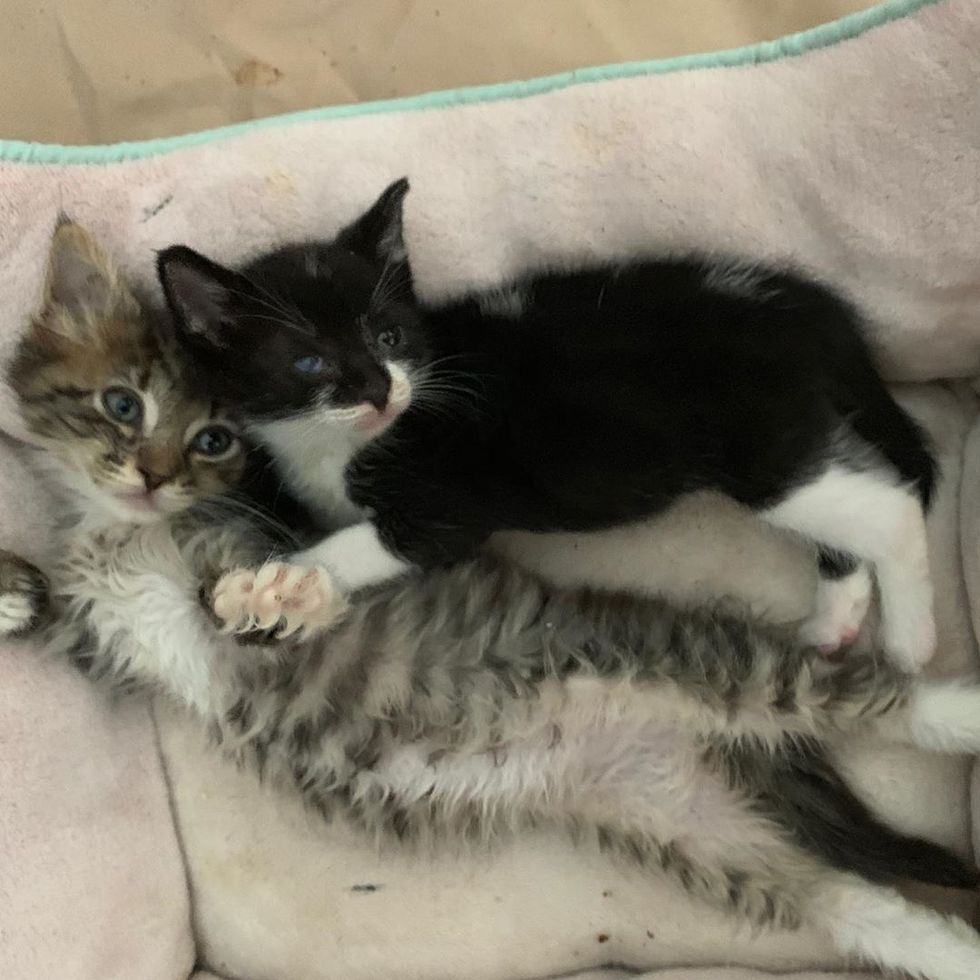 Knowing that orphaned kittens do much better with a friend, they paired her up with another rescued kitten, Mochi.