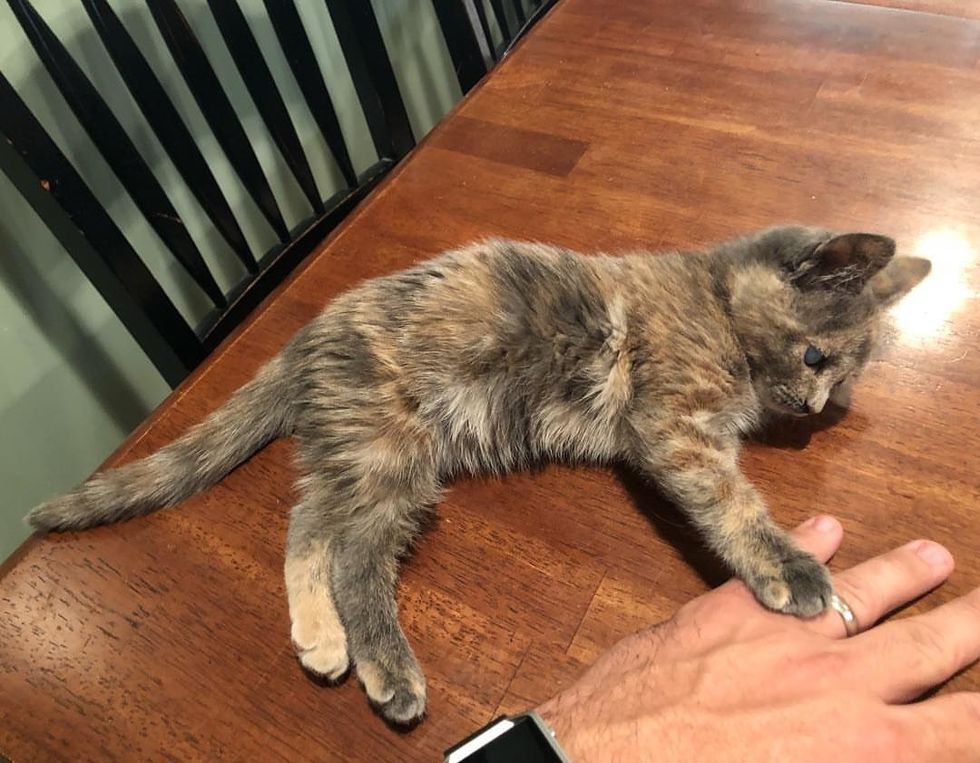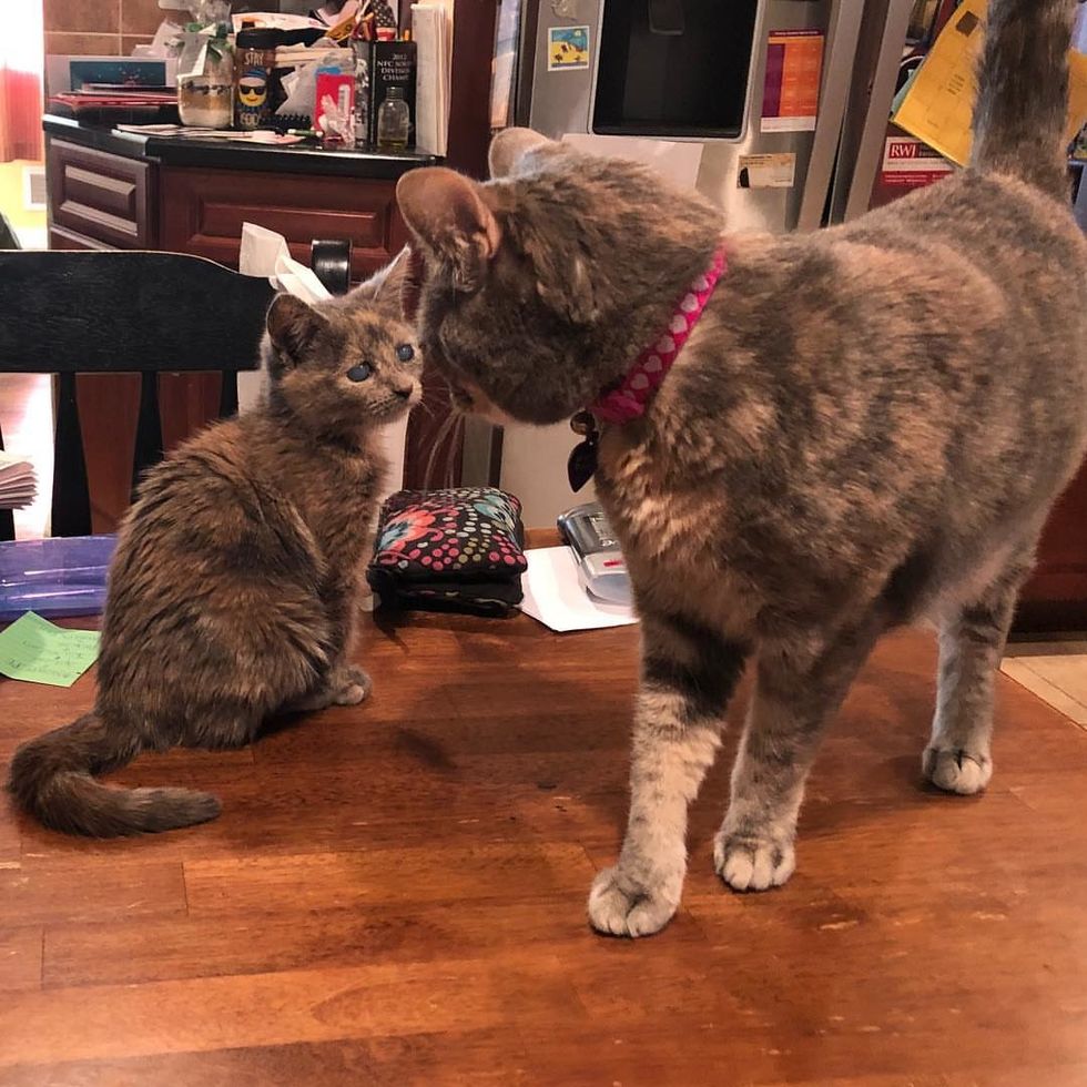 When they finally met the kitten, they were surprised by how tiny she was. "When we adopted her, she was about the size of the palm of our hand."