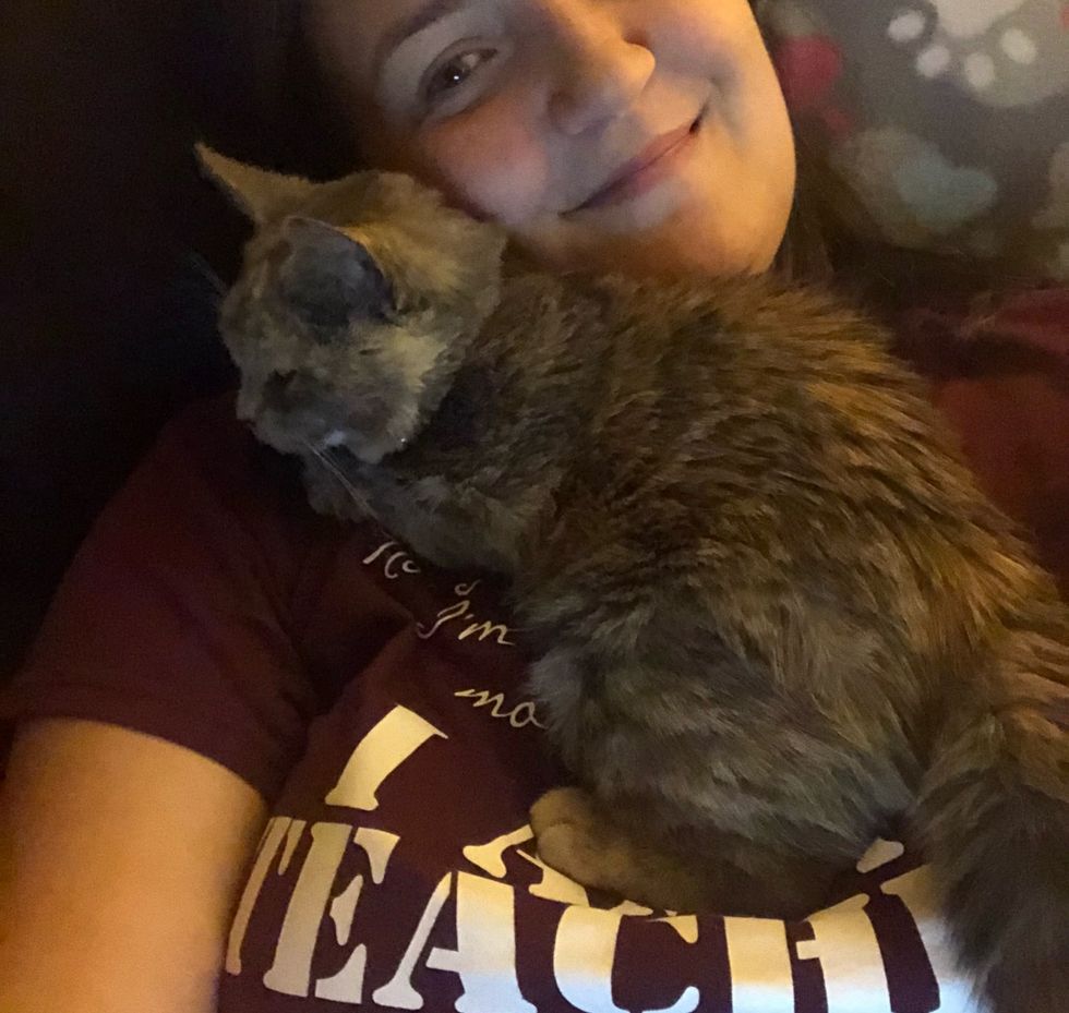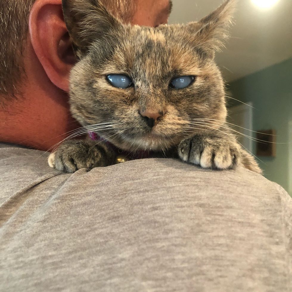 "If we are sitting on the couch, she walks up on the back of the couch and onto our shoulder and finds the nook of our necks to cuddle up and snooze," Tracy told Love Meow.
