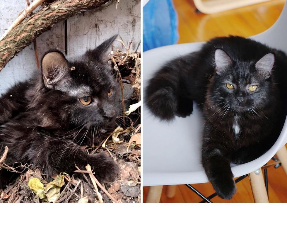 A stray kitten who was found hiding under leaves, blossomed into a confident, beautiful cat.