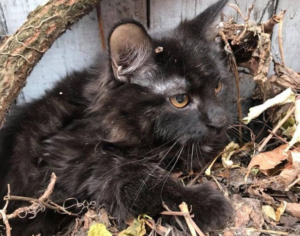 Celine Crom of Chatons Orphelins Montréal dropped everything at hand and rushed to the location. When she arrived, the kitten was still there with his head tucked in the leaves.