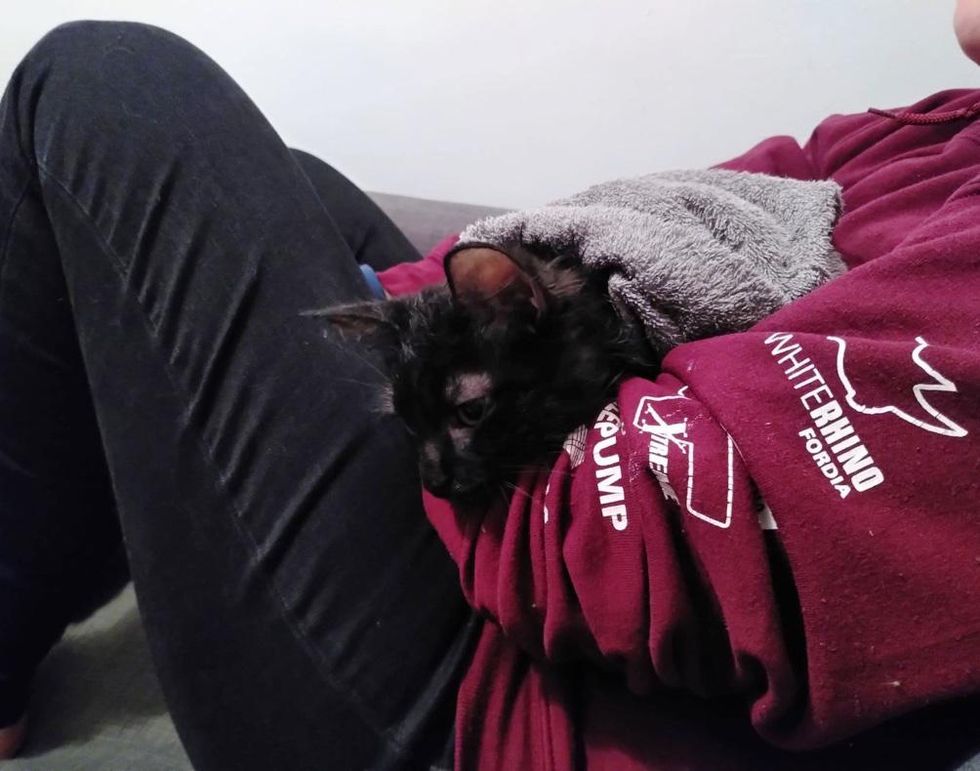 To help Mika overcome his fear around people, she gently wrapped him in a towel and cuddled with him several times throughout the day. The kitten averted eye contact at first, but once he realized he was safe, he started to let out a little purr.