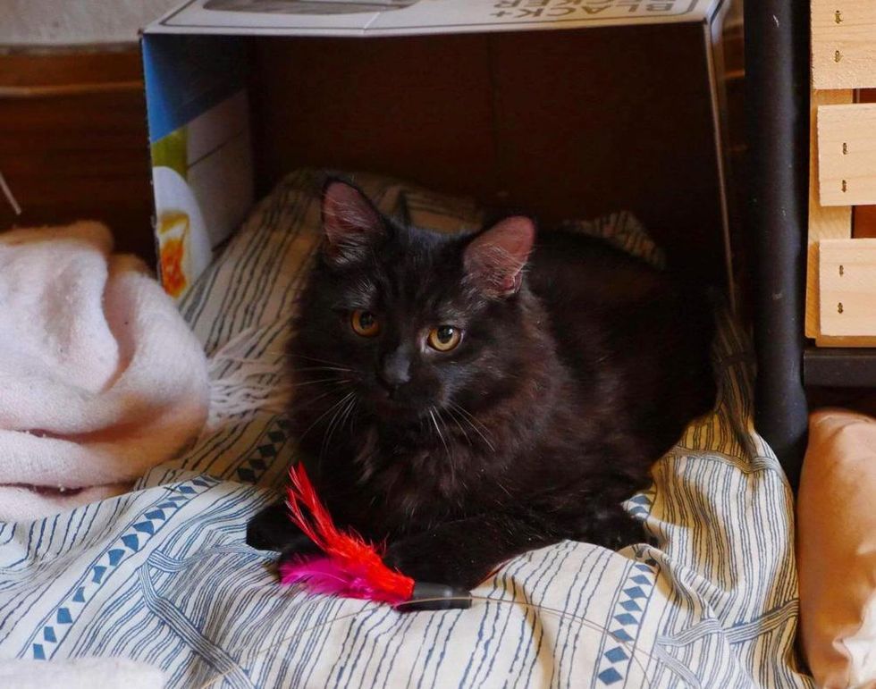 The kitten was estimated to be seven months old. He was very timid and hid behind a snuggle toy at the vet. Slowly but surely, he began to warm up to people.
