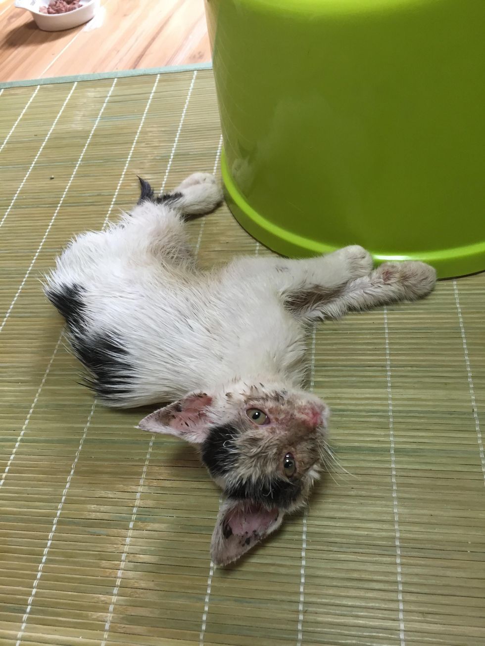 After scarfing down a bowl of food, the kitten collapsed on the floor as his legs were giving out. The young woman rushed him to the nearest vet and they admitted the kitten to the hospital for the next two days.