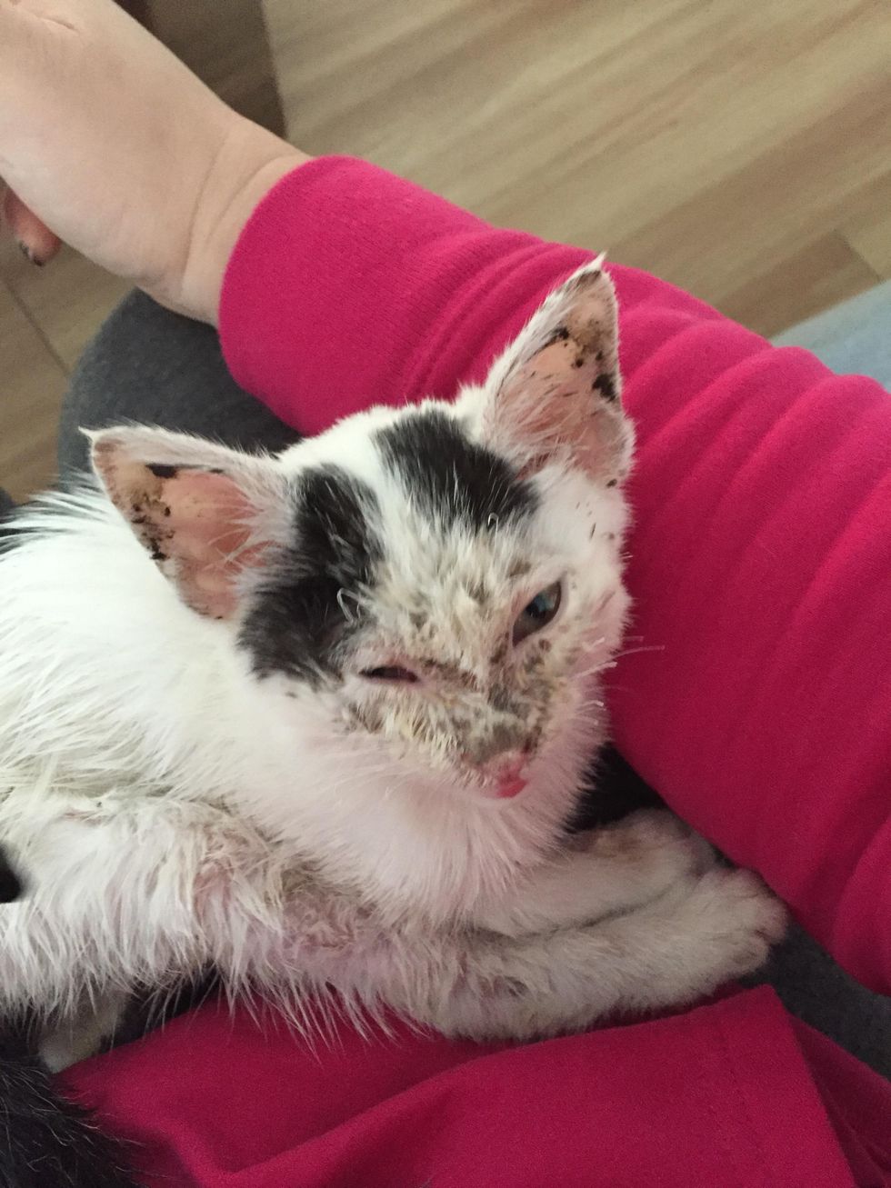 "You could tell he wasn't doing well. He had barely any strength in his legs. He was covered in sticky black stuff that felt like tar (turned out to be rat trap adhesive), he was sneezing and wheezing and he had discharge from both of his eyes."