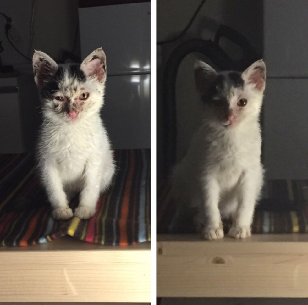 A 5-week-old kitten walked up to a young woman and let out a silent meow for help. What a difference a week makes!