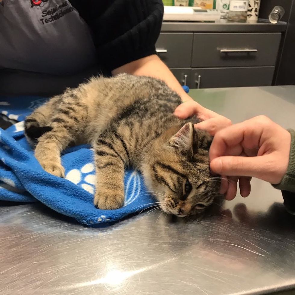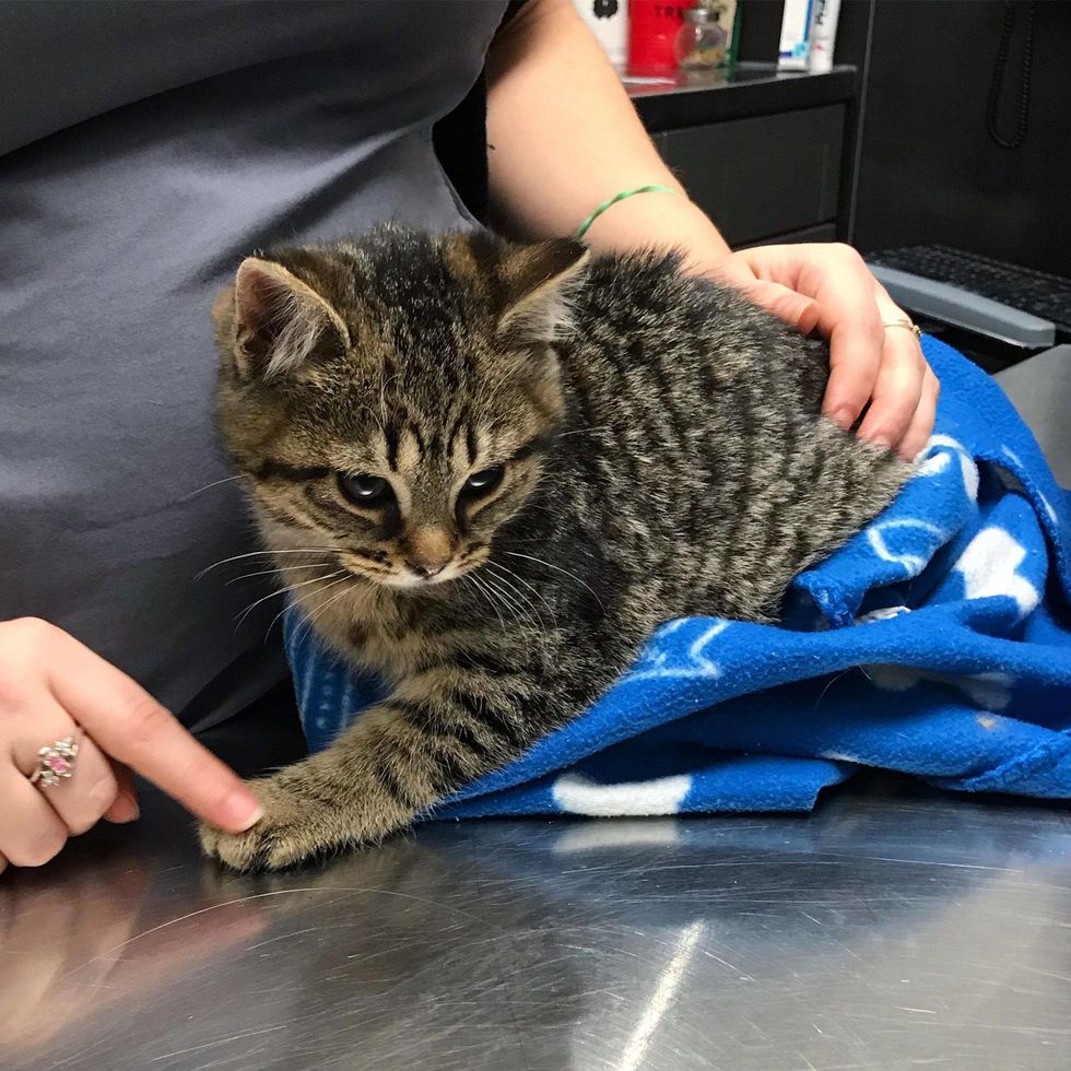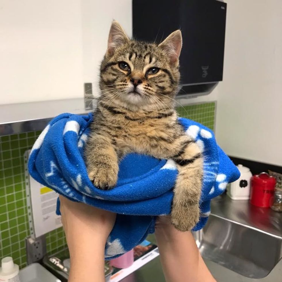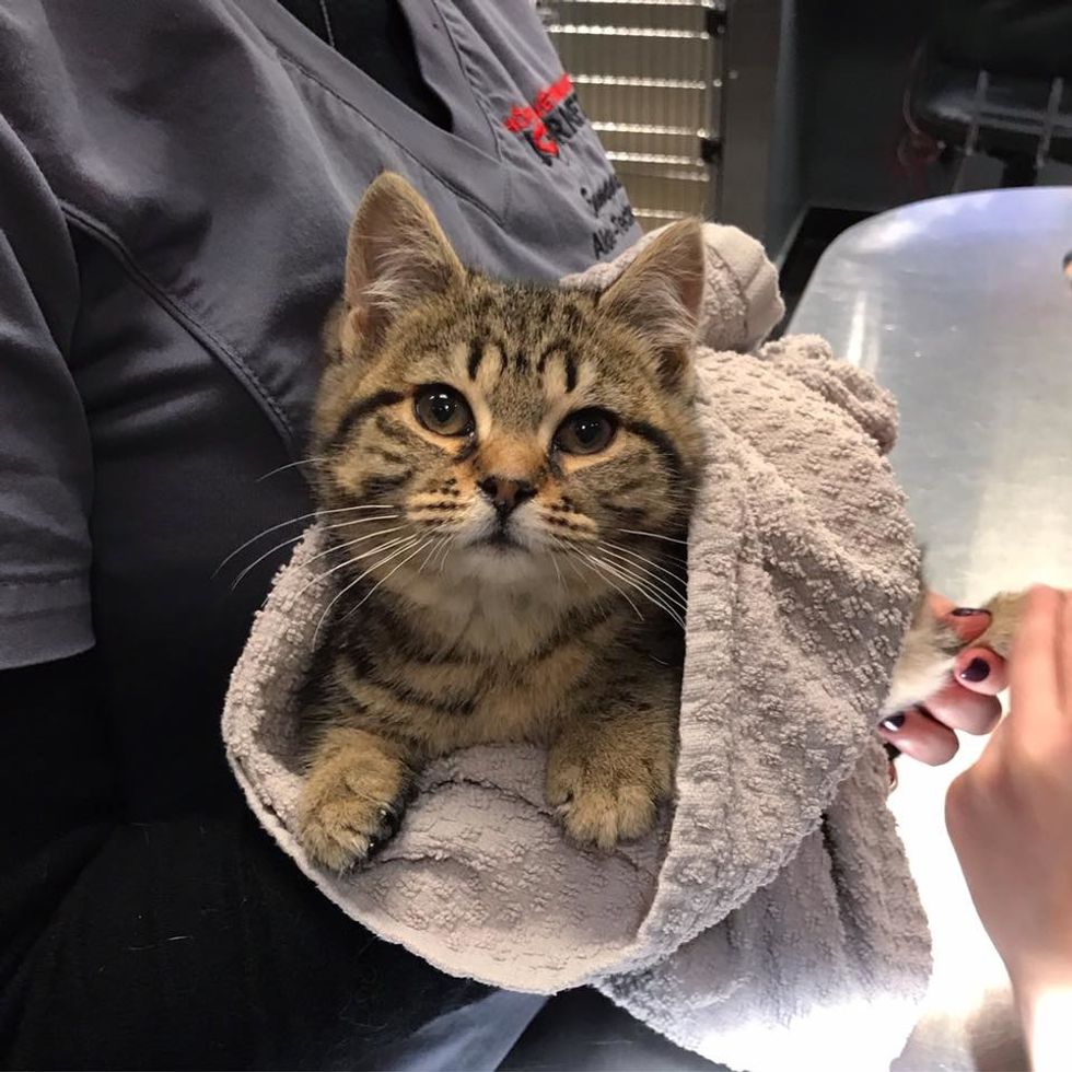 Chatons Orphelins Montréal, a local rescue group, was contacted about the kitten needing help and foster care. The rescue sprang into action — arranged a foster home and transport, and welcomed the kitten in with open arms.