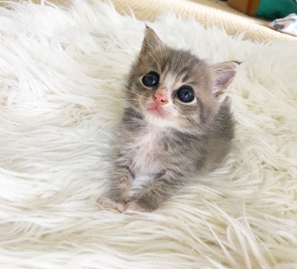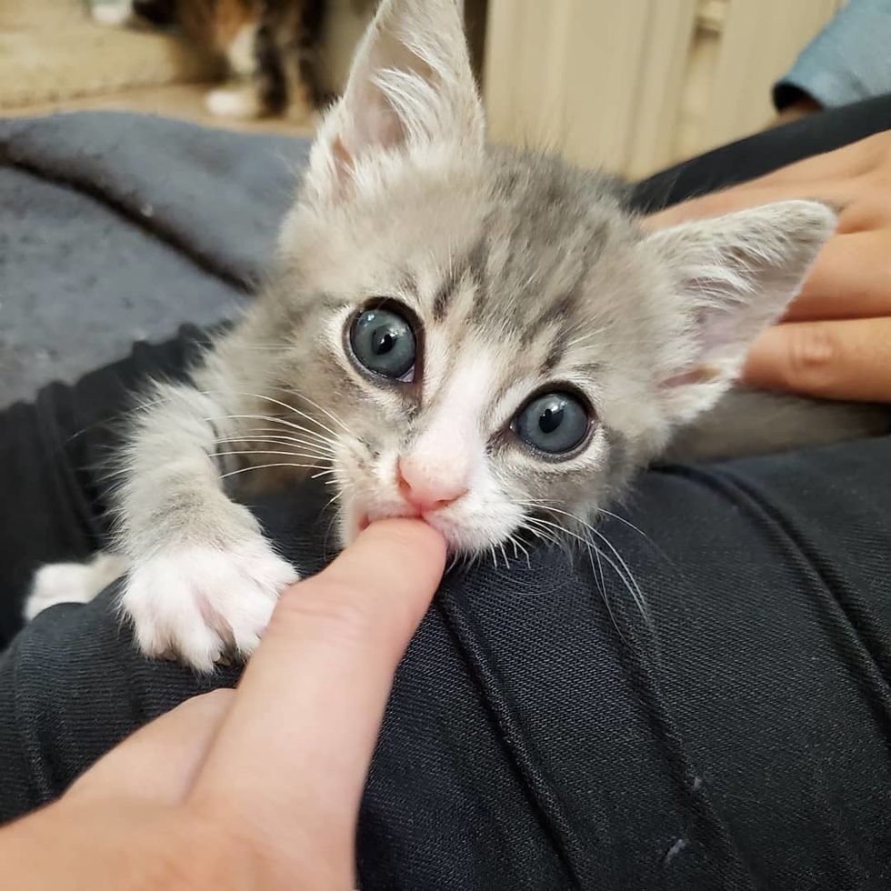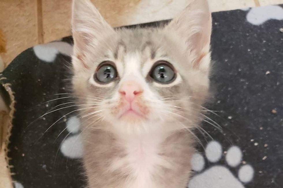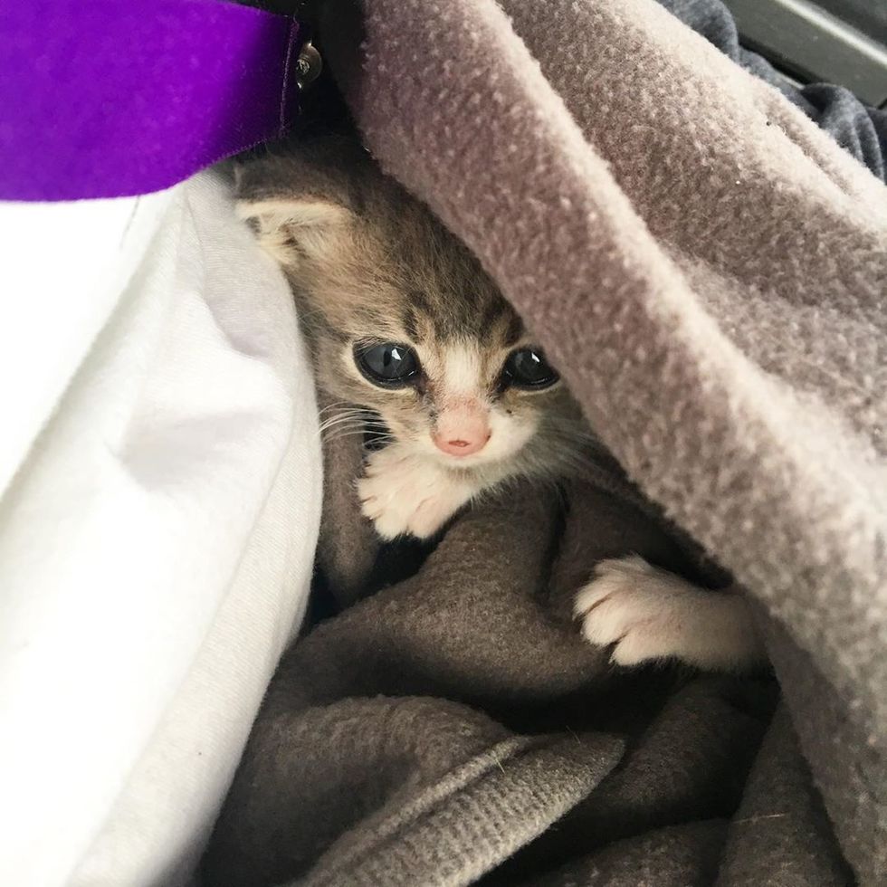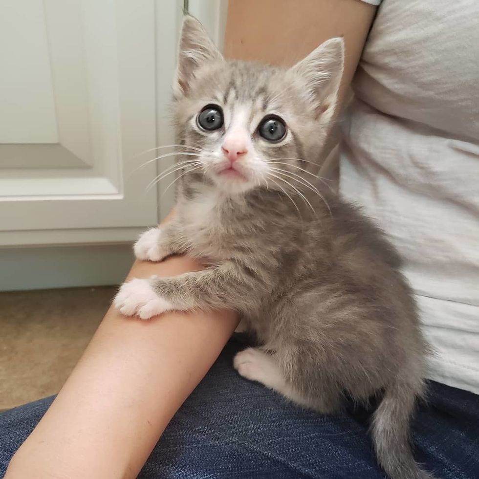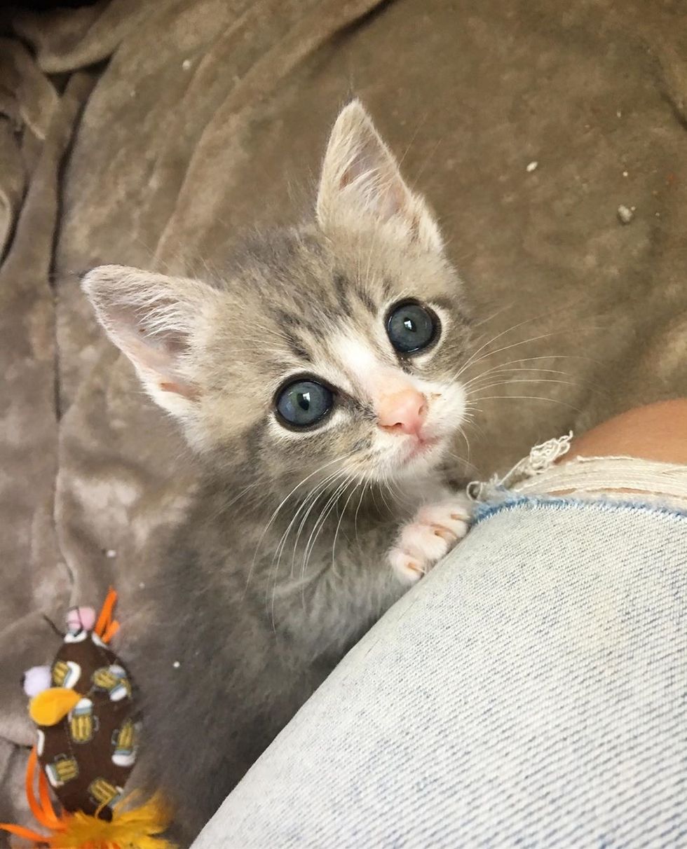 After scouring the area, she found a tiny ball of fur on the steps of a porch by himself. The kitten had no mom or home to go to, so Jamie reached out to get the kitten help.