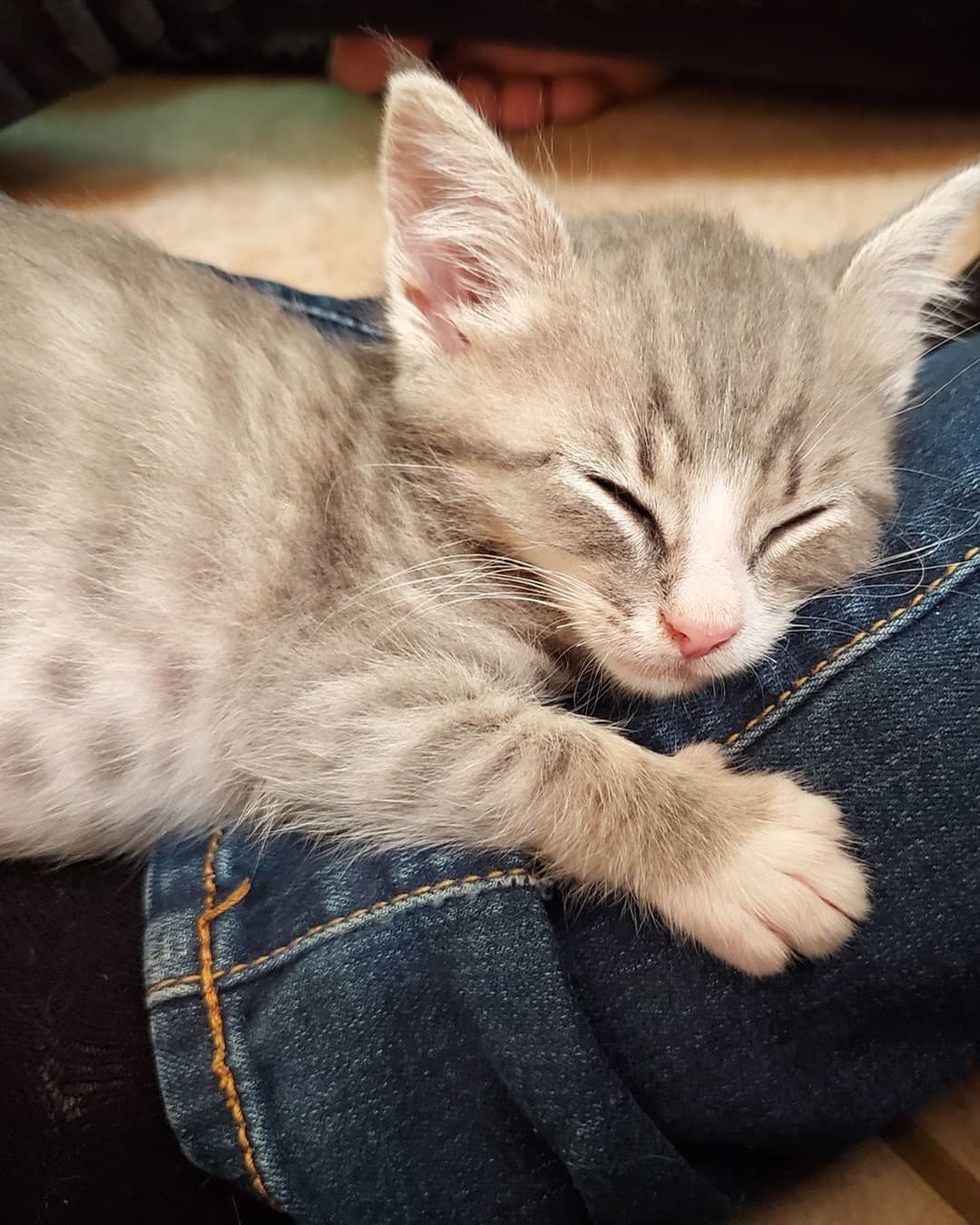 It didn't take long for the kitten to wrap his arms around his foster mom and fall fast asleep. A few days after his arrival, he was introduced to his new siblings. They quickly hit it off.
