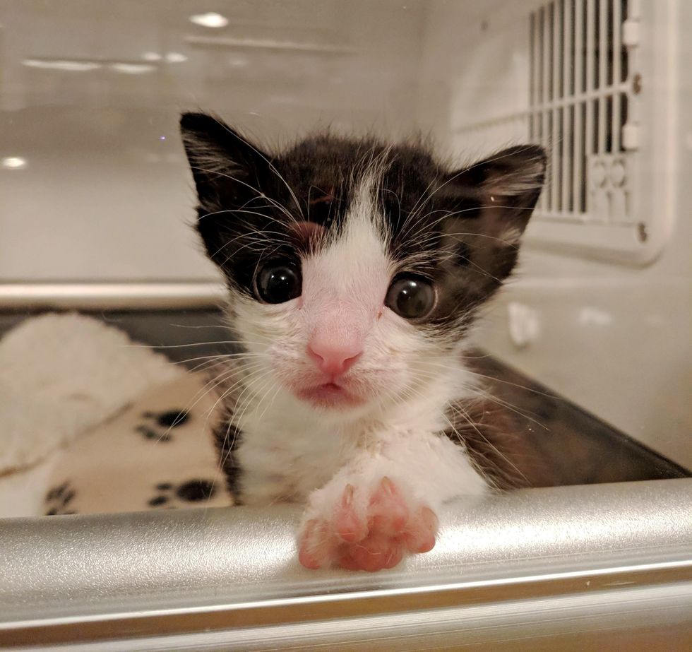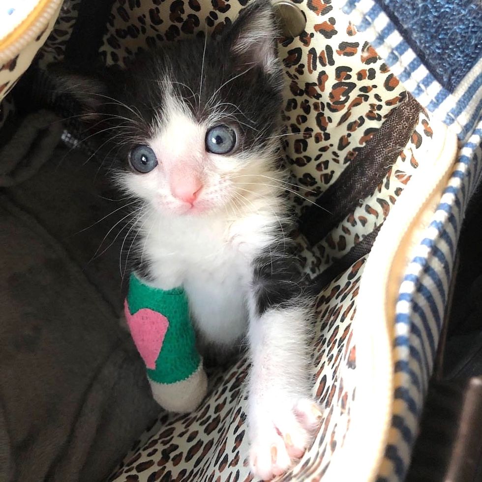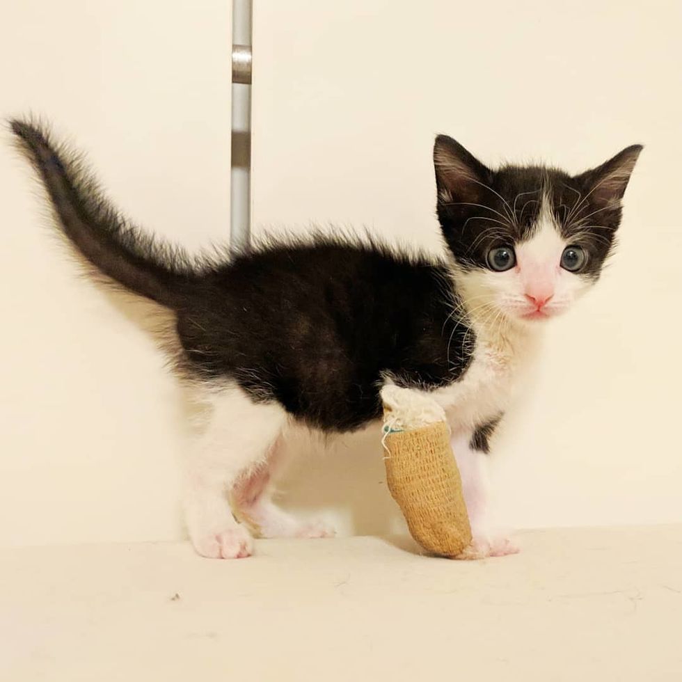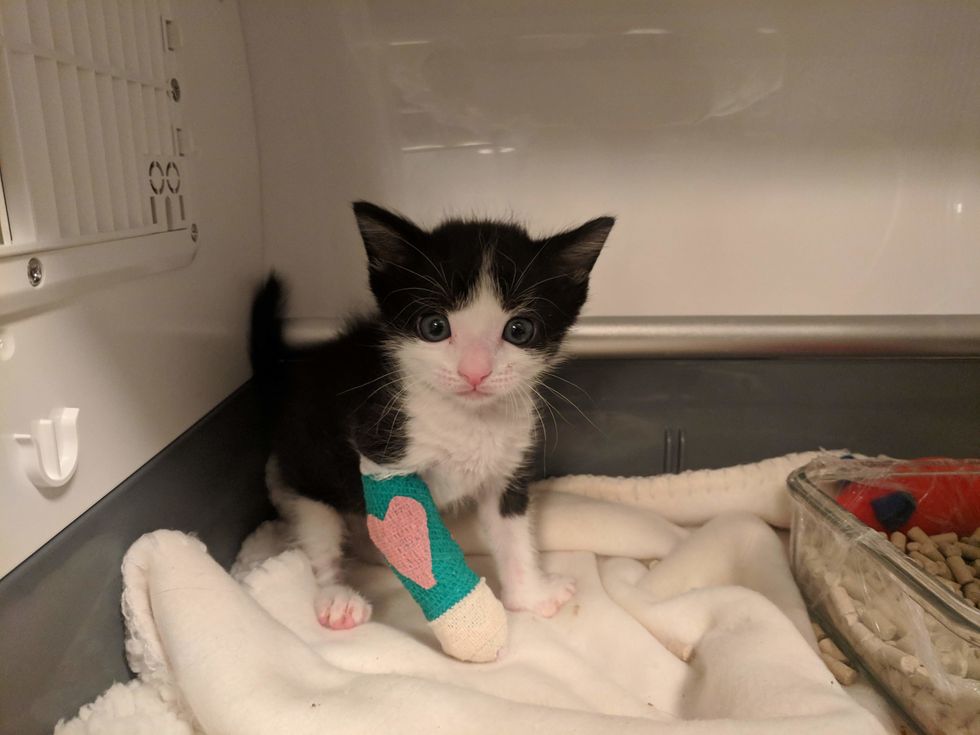 Christina Ha, co-founder of Meow Parlour, took in the 4-week-old tuxedo after she learned about his plight. At the vet, they discovered that his right front leg was broken in two places.