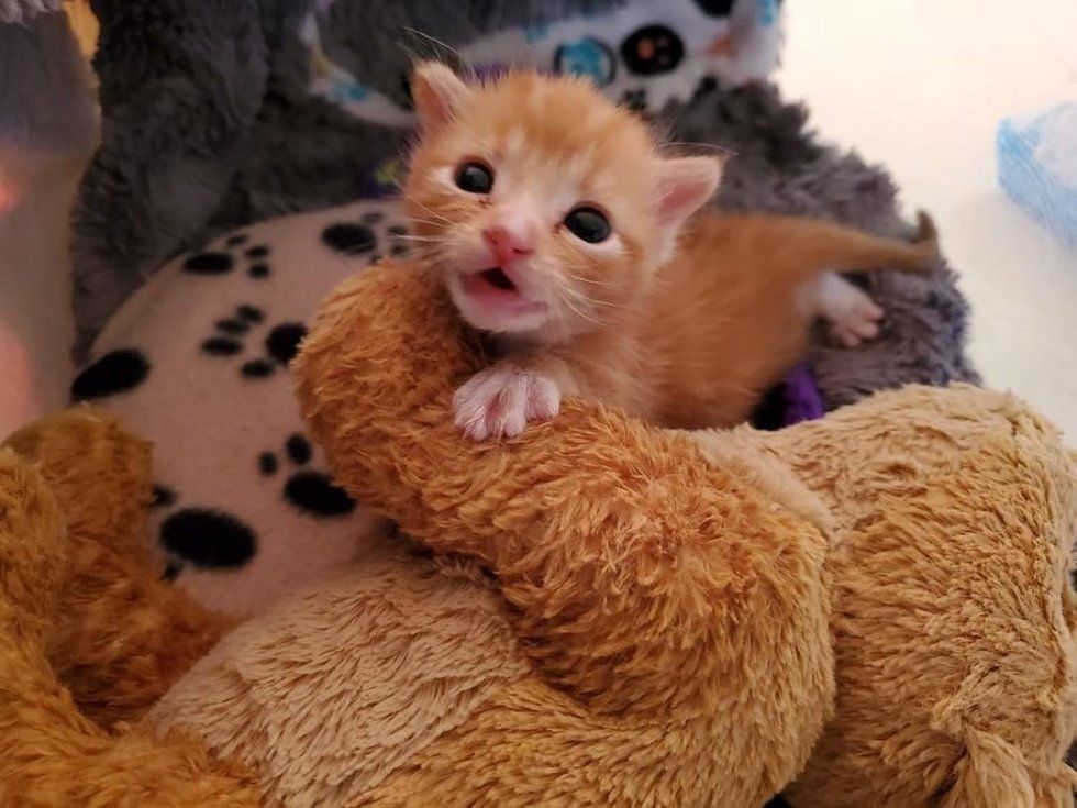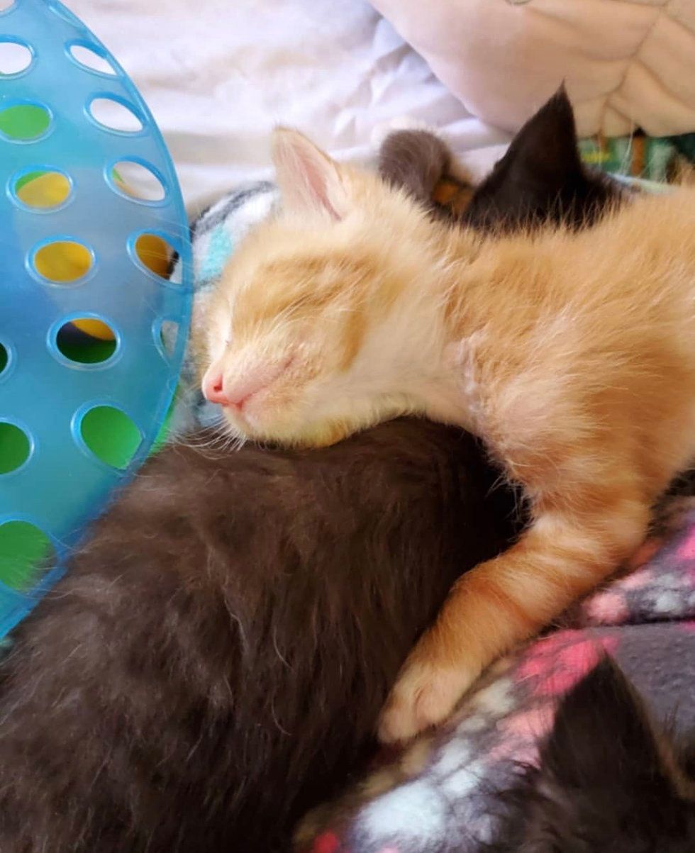 When the ginger boy was ready, he was placed in the same playpen with the other kittens. Despite being the youngest of the bunch, they hit it off instantly and started playing and chasing each other like one big family.