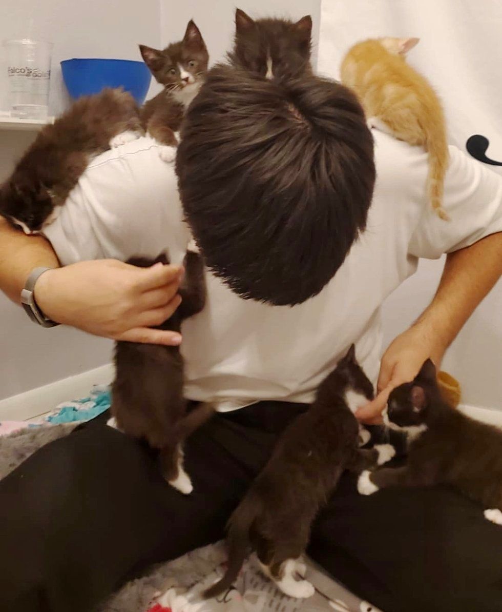 When their foster parents enter the room, the gang swarms them, crawling up on their back or lap for attention. Shelbi and Brandon often find themselves buried under tiny balls of fur, covered in purrs.