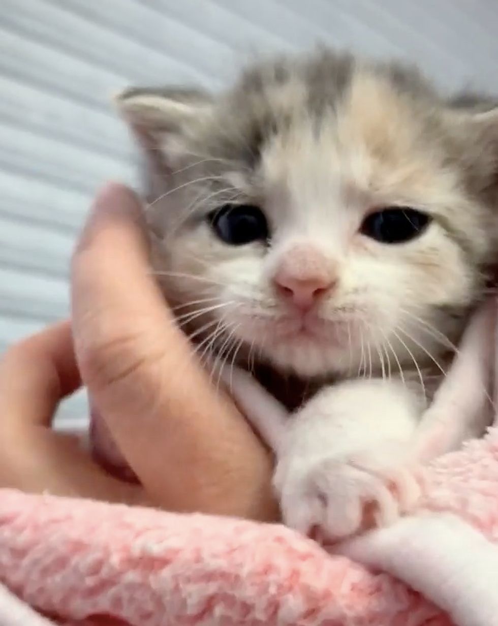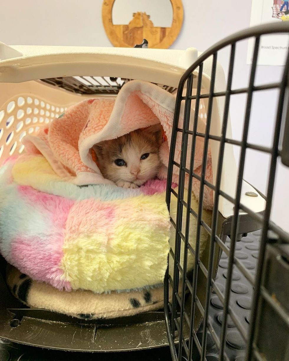 Early this week, Kristi and Eric, volunteers of Sparkle Cat Rescue (in Burlington, North Carolina), spotted a Facebook post about a kitten needing urgent help. They immediately responded, but later found out she had been taken to a shelter before they could get to her.
